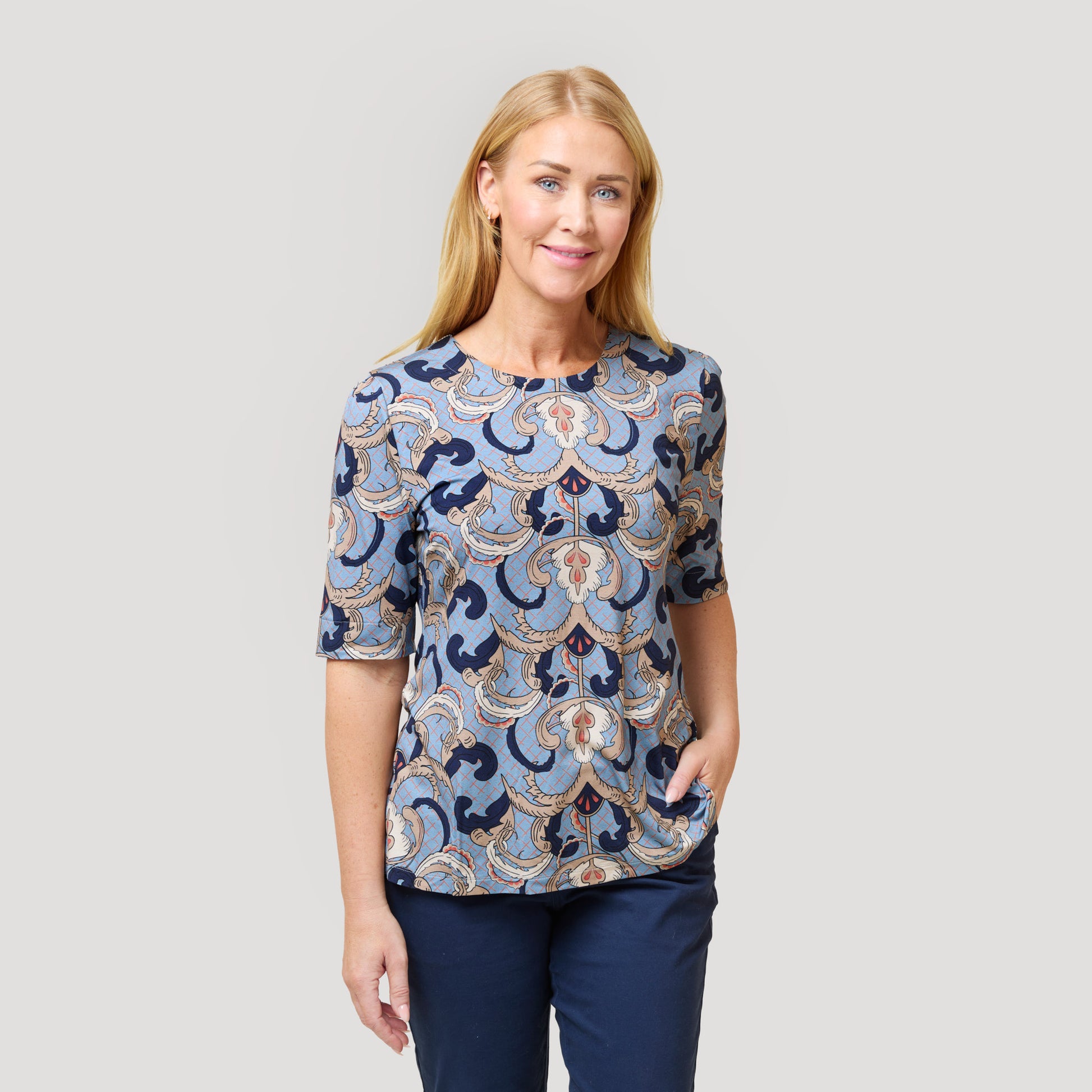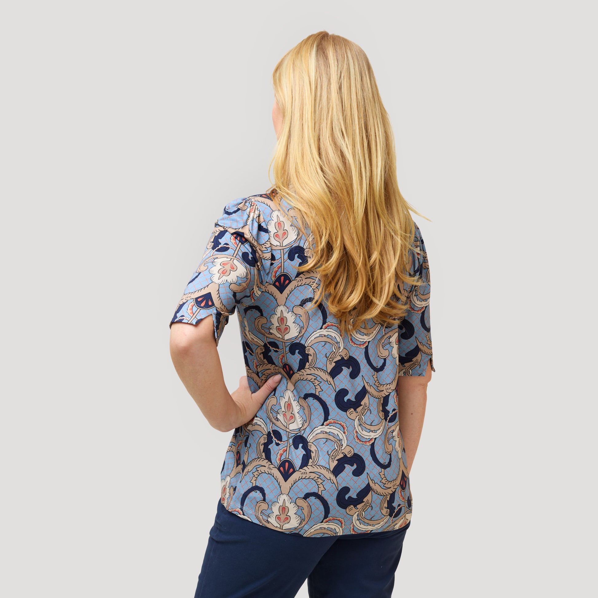 Skön, smickrande topp i viskos med ett fint mönster i blått och beige med inslag av rost. Mönstrad trikåtopp med en rund hals med en bredare halskant. Toppen har en längre t-shirt ärm med liten puff upptill och en slits baktill. Vår modell Marianne är 170 cm och har storlek S på sig.