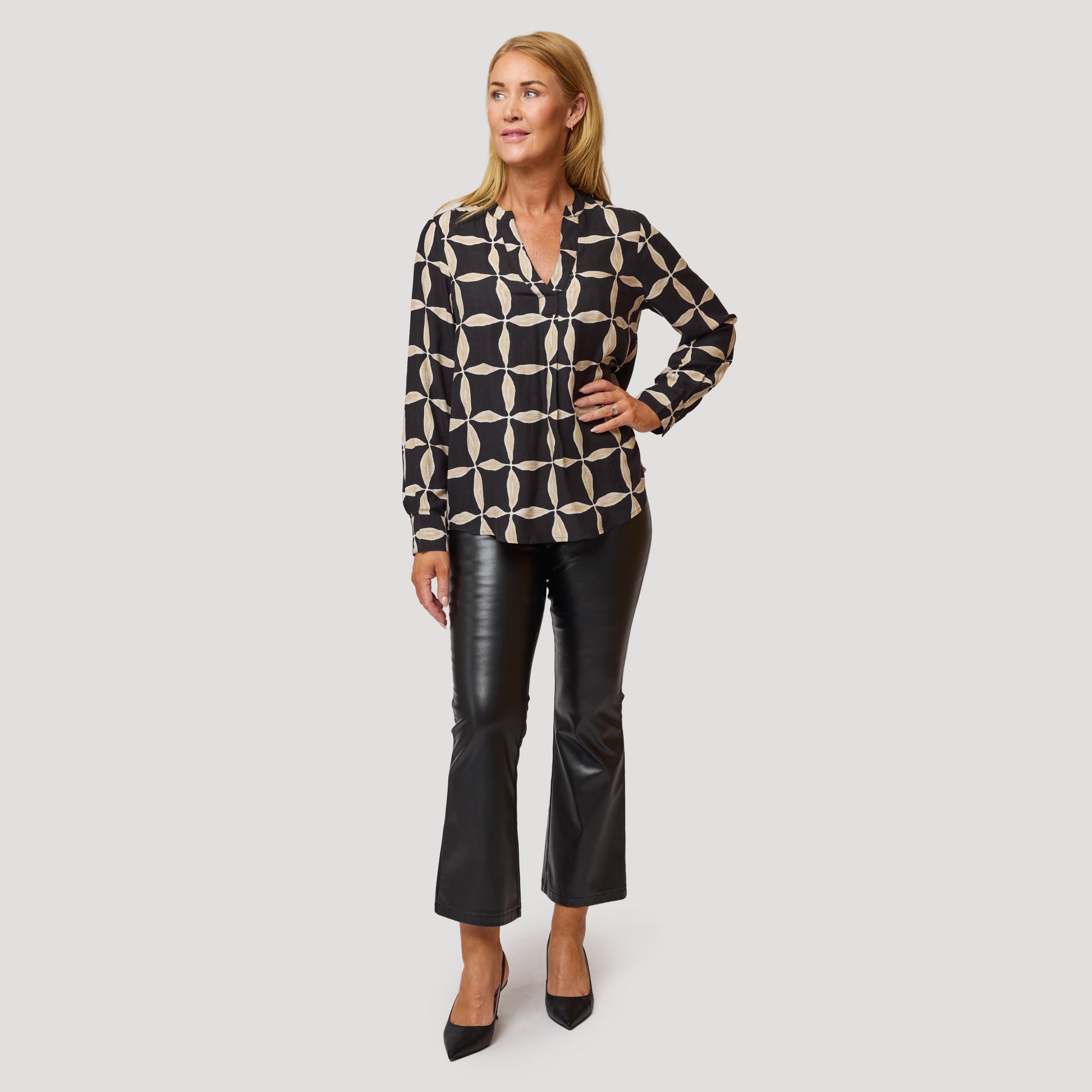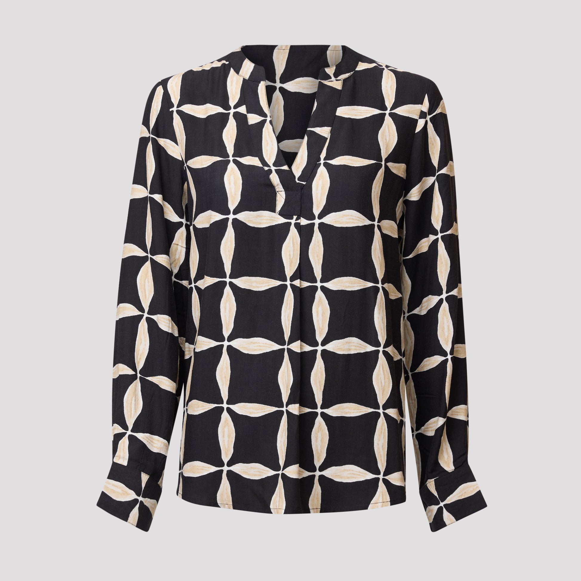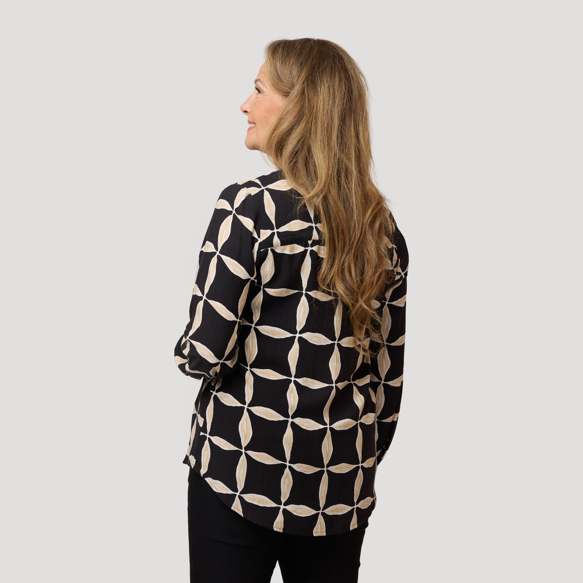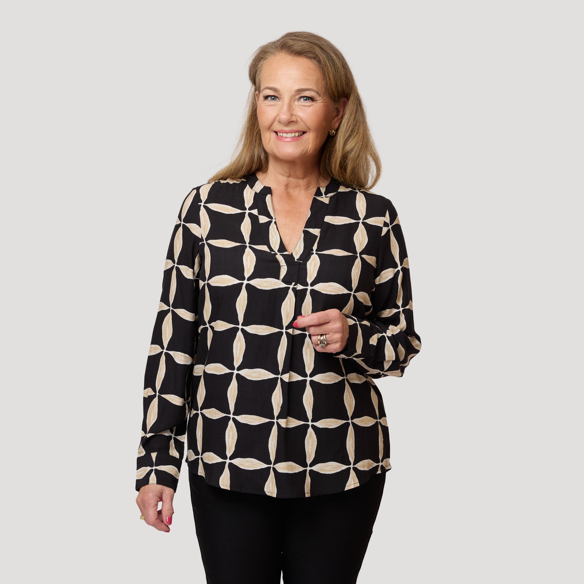 Snygg blus i viskos med lite glans och ett fint handritat mönster i svart och beige. Blusen har veck framtill, manschetter och sprund på ärmen och en fint rundad nederkant som är något längre baktill. Vår modell Yvonne är 170 cm och har storlek M på sig.