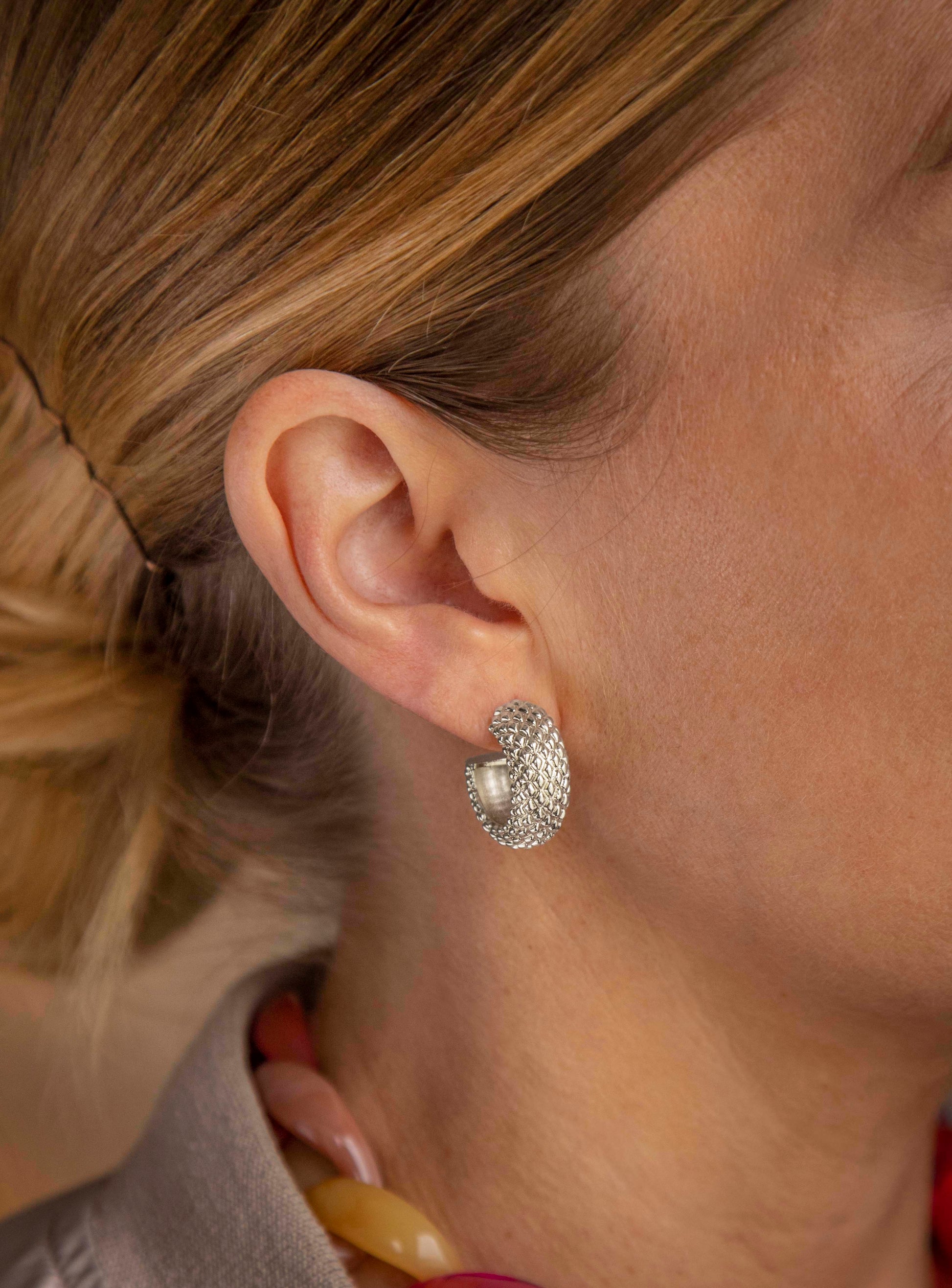 Ett 925 silverpläterat örhänge som har en fin struktur som gör att det blänker fint i ljuset. Hoopen är 22 mm i diameter och 9 mm bred. Stift i kirurgiskt stål. Nickelsäker.