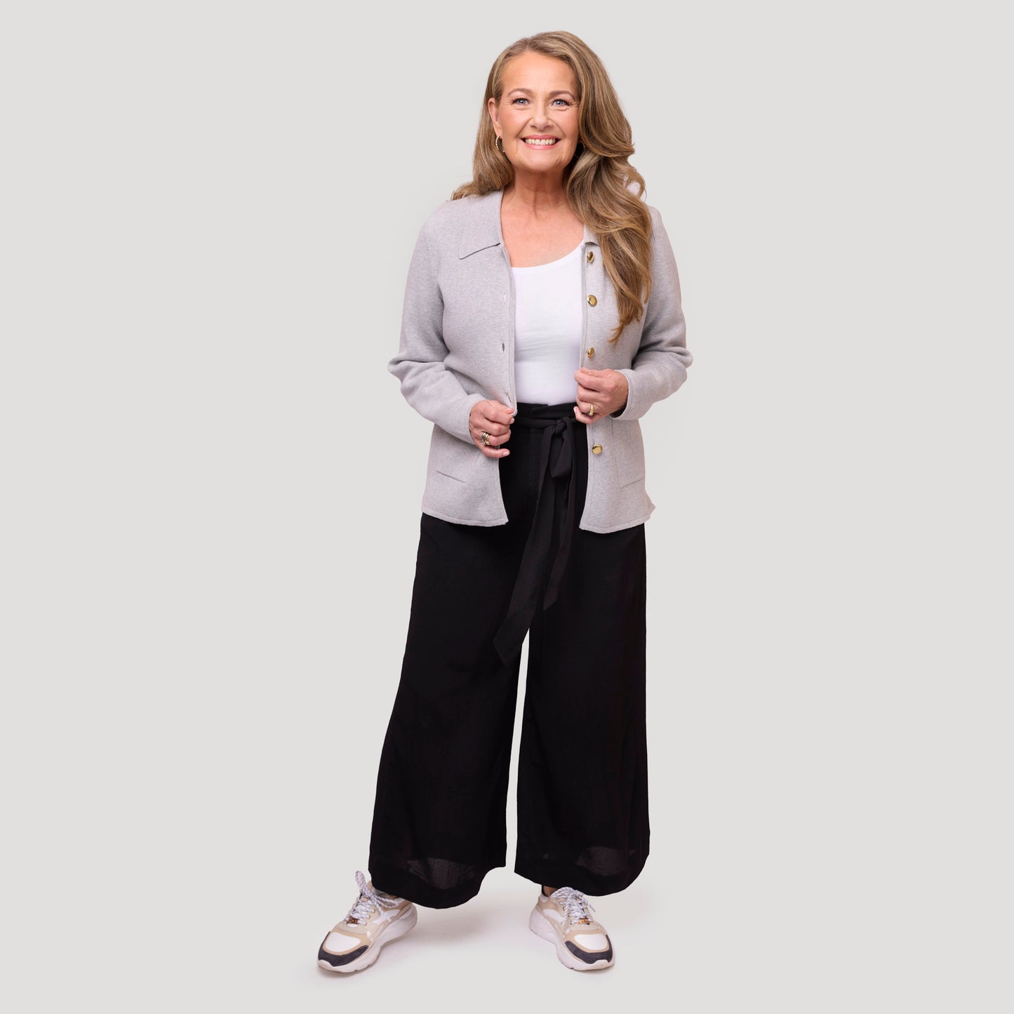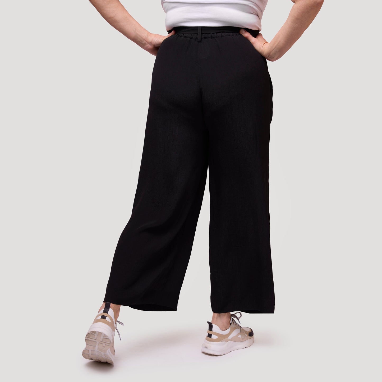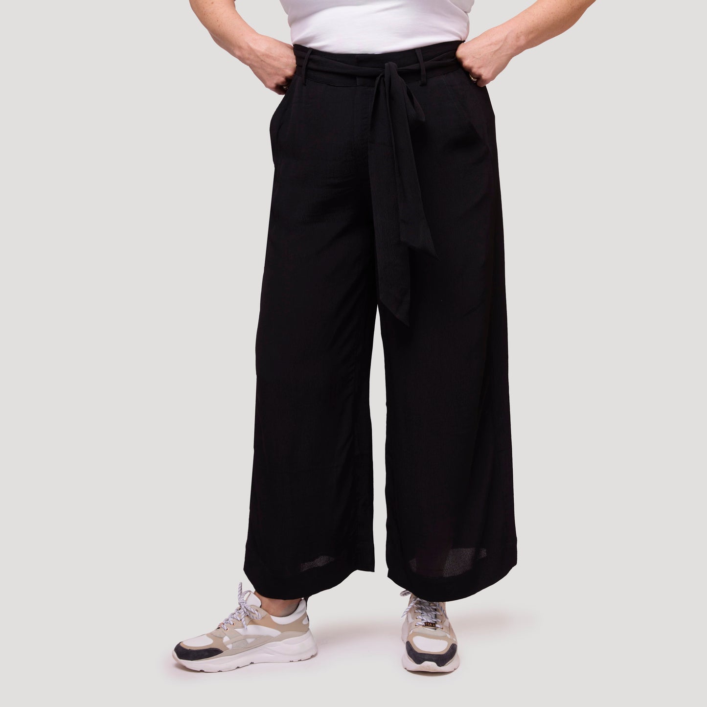 Sval, svart vid byxa i viskos crepe med resår baktill. En tunn härlig sommarbyxa i tyg med struktur som stängs med dragkedja fram och hyskor och hakar i linningen. Till byxan medföljer ett avtagbart brett knytskärp. Byxan krymper vid tvätt så plagget behöver strykas. Vår modell Yvonne är 170 cm och har storlek M på sig. Byxa från Alice Bizous.