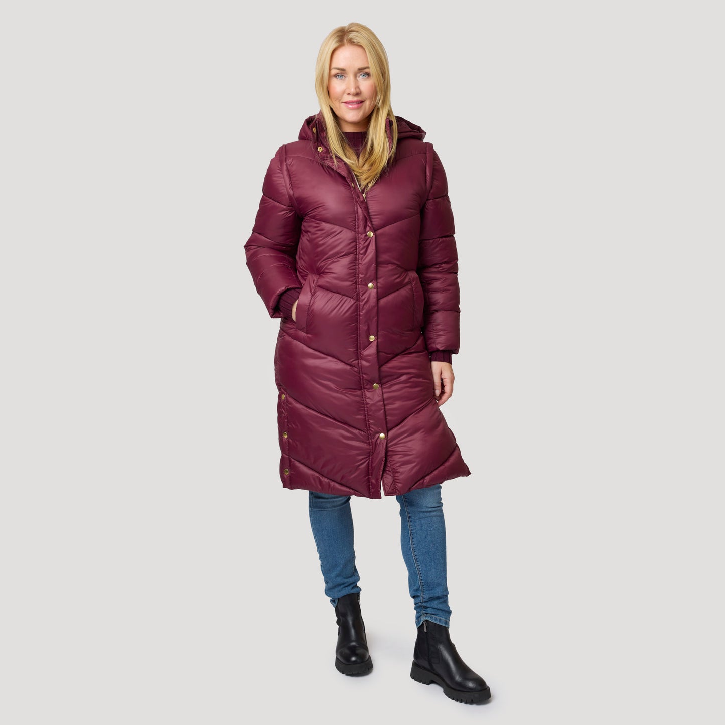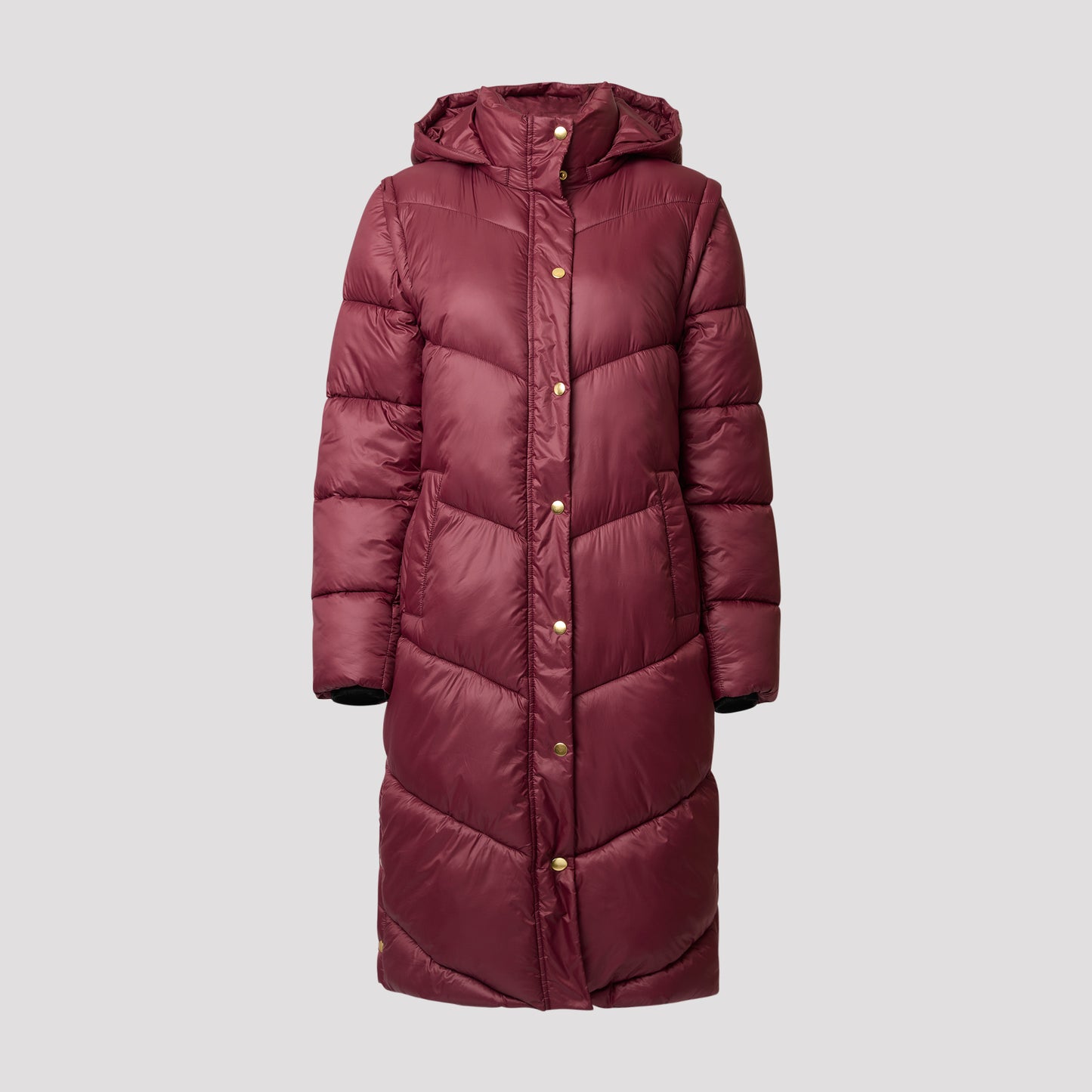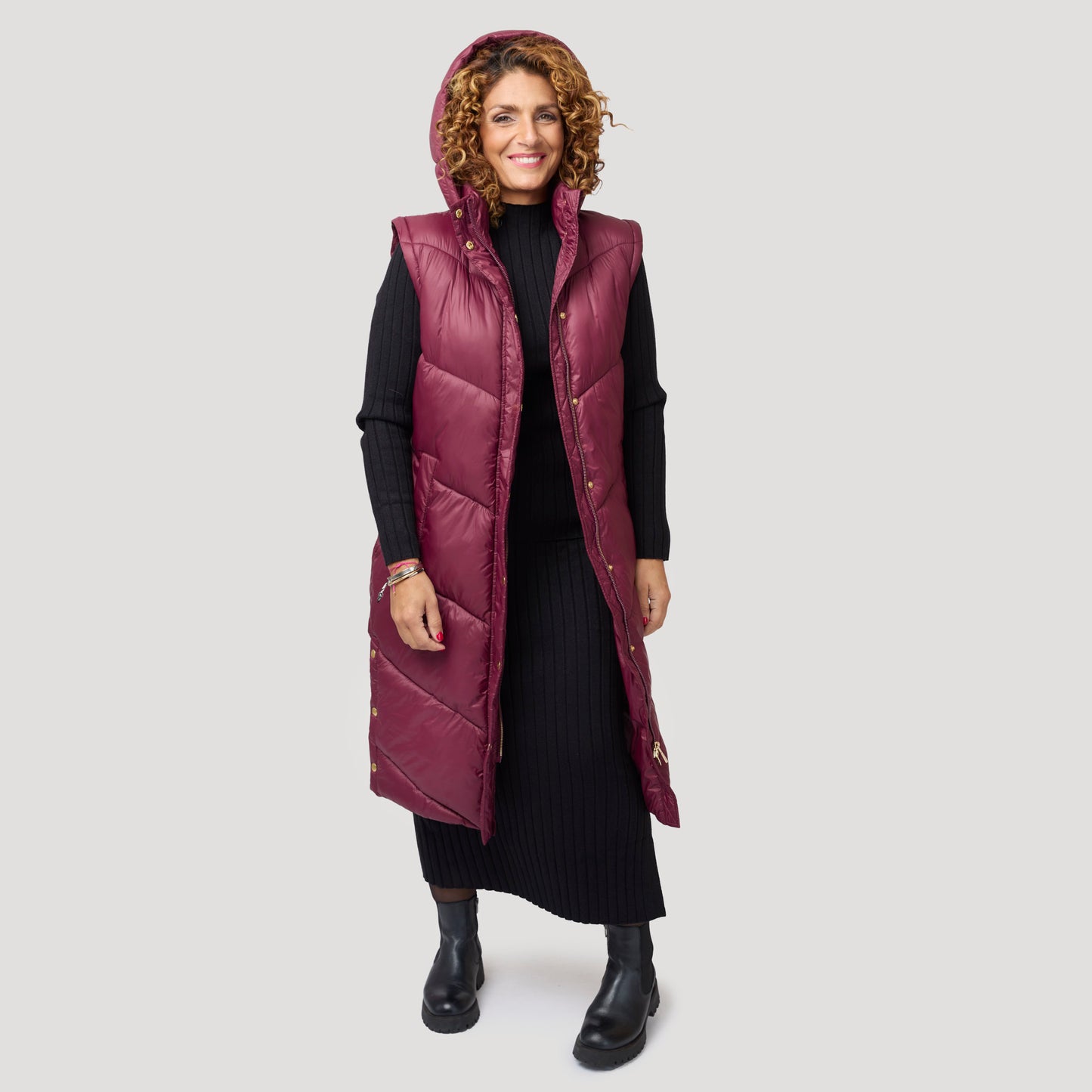 Varm, vinröd täckjacka med avtagbara ärmar så att den även går att bära som väst. En längre, kviltad jacka med fickor i sidorna och en innerficka. Jackan har muddar inne i ärmen i nederkant och dragkedja under knappslå med tryckknappar framtill så att ingen vind kommer in. Jackan har en avtagbar huva och ärmar med dragkedjor ton i ton och slitsar med knappar i sidorna för ökad rörlighet. Vår modell Marianne är 170 cm och har storlek S på sig.