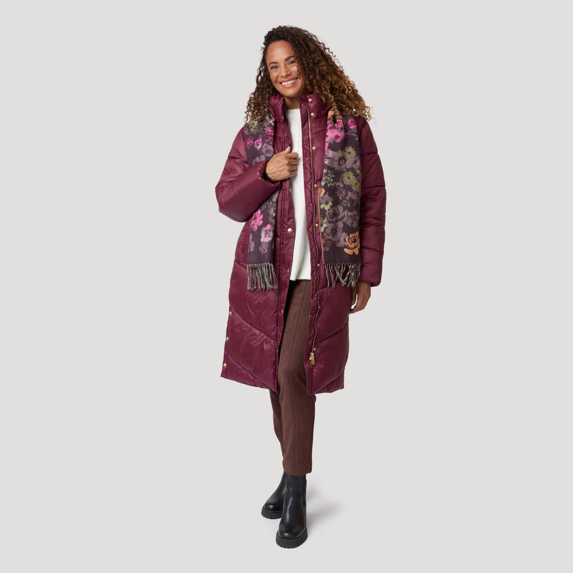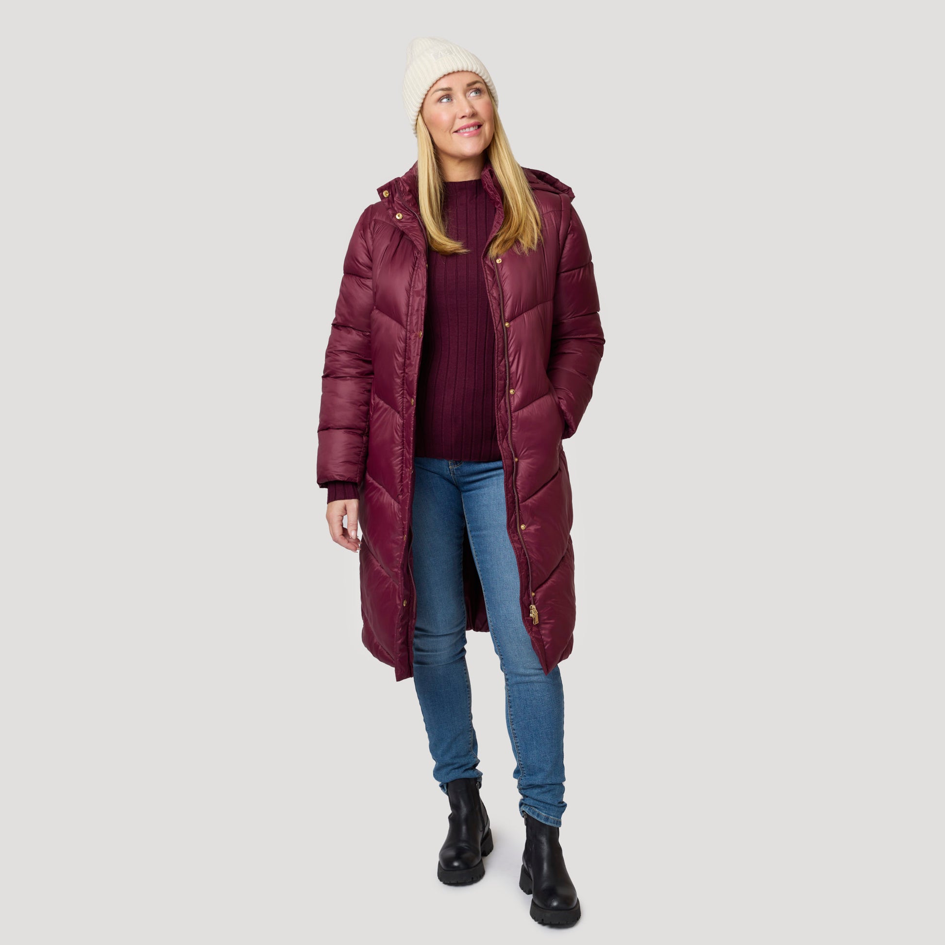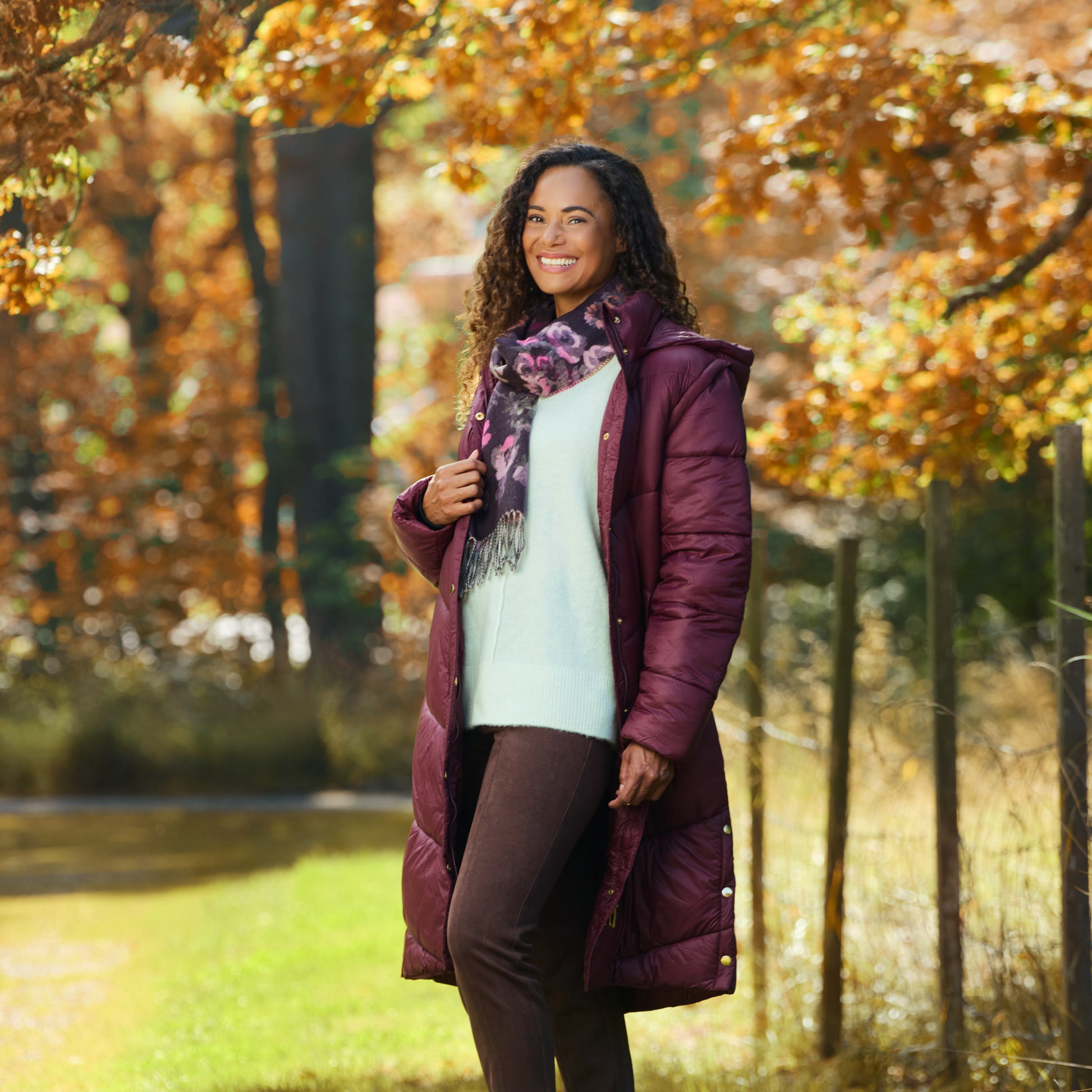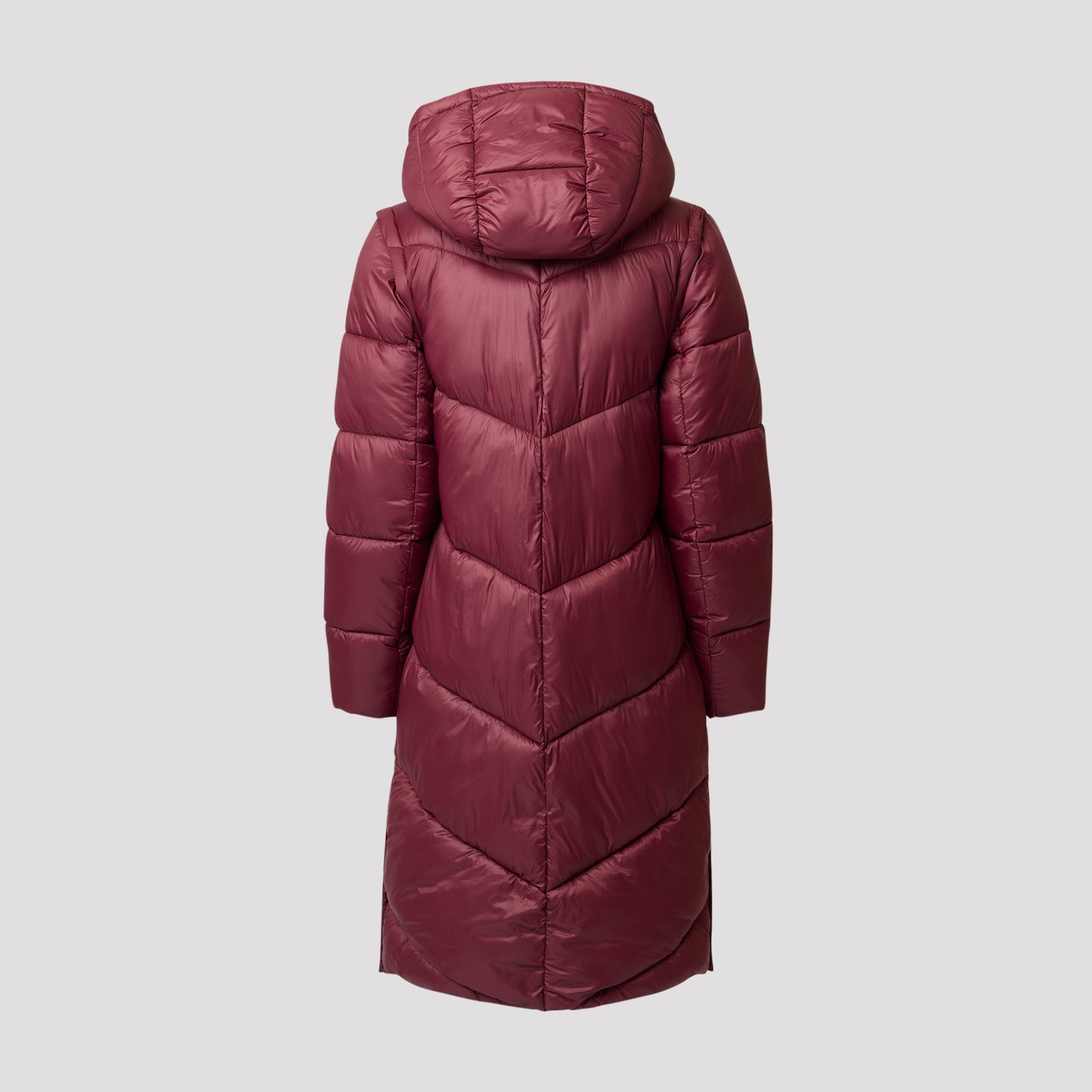 Varm, vinröd täckjacka med avtagbara ärmar så att den även går att bära som väst. En längre, kviltad jacka med fickor i sidorna och en innerficka. Jackan har muddar inne i ärmen i nederkant och dragkedja under knappslå med tryckknappar framtill så att ingen vind kommer in. Jackan har en avtagbar huva och ärmar med dragkedjor ton i ton och slitsar med knappar i sidorna för ökad rörlighet. Vår modell Marianne är 170 cm och har storlek S på sig.