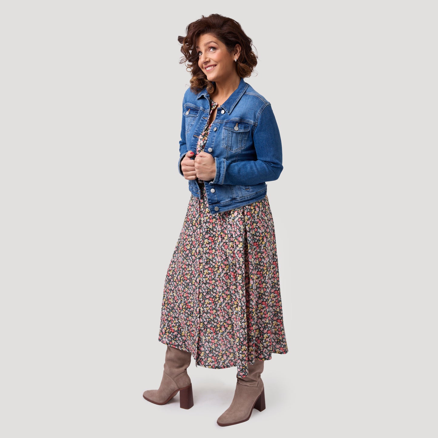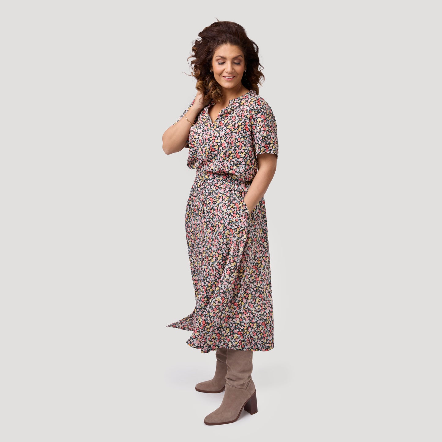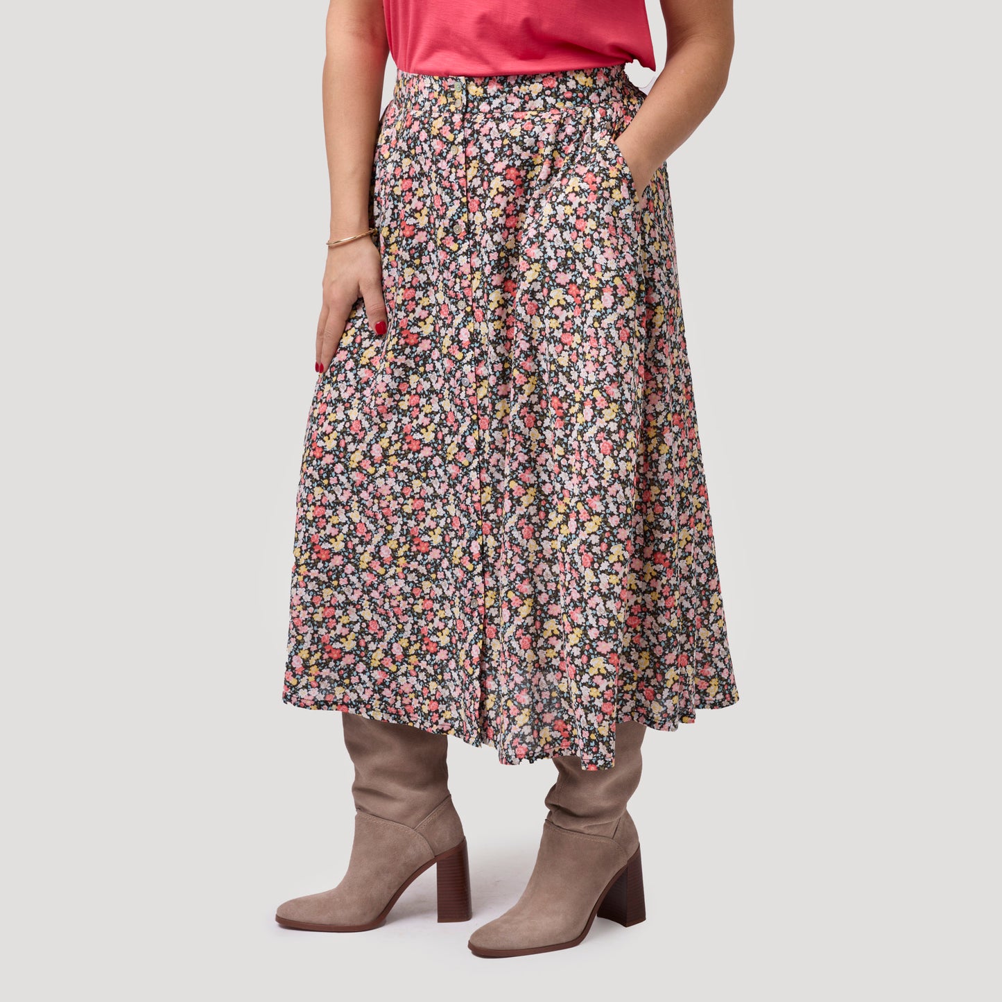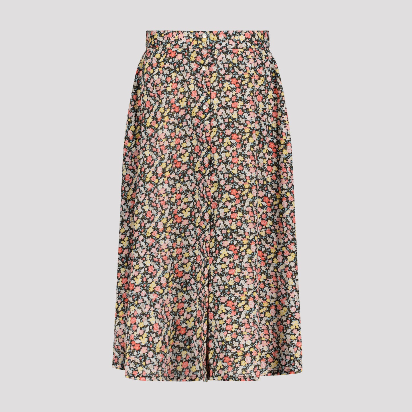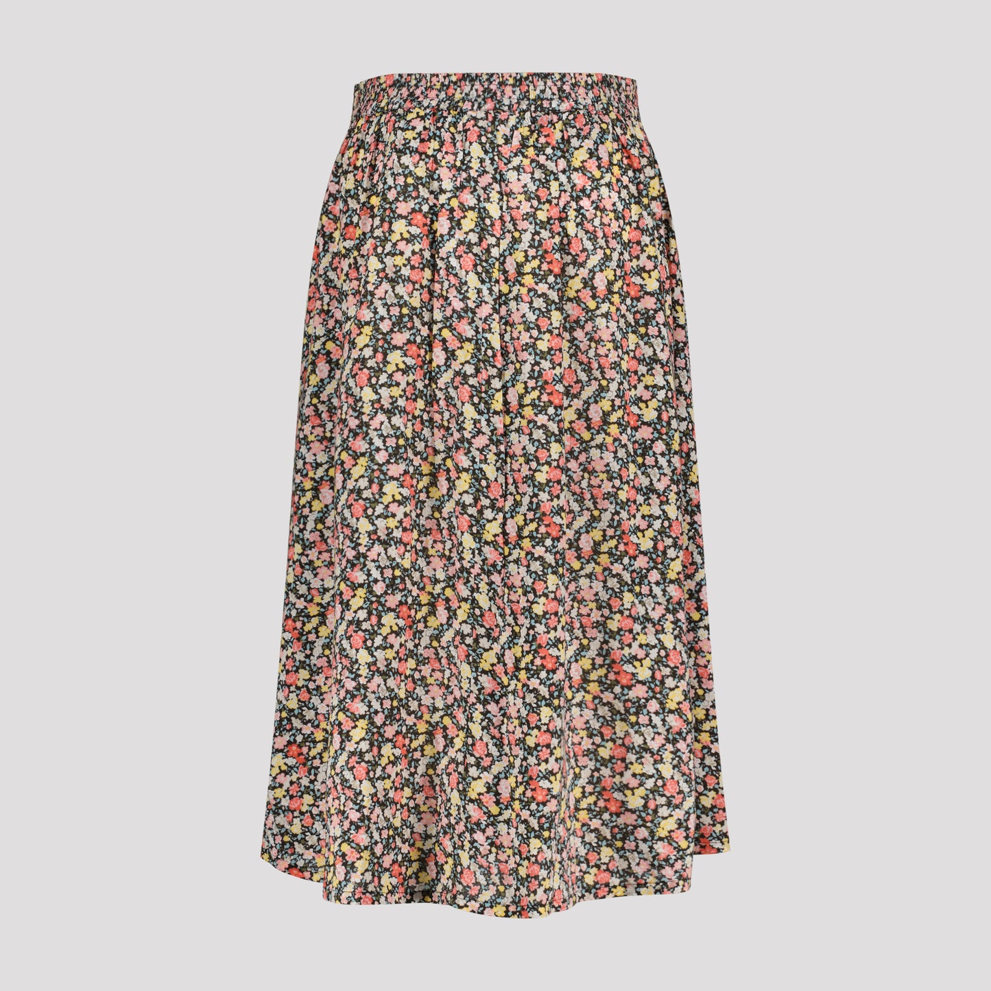 Blommig, kjol med resår i midjan i viskos. Sommarkjol med fina knappar framtill och fickor i sidorna. Till kjolen finns även en matchande blus ifall man vill bära den som en klänning. Vår modell Yasmine är 163cm och har storlek S på sig. Kjol från Alice Bizous.