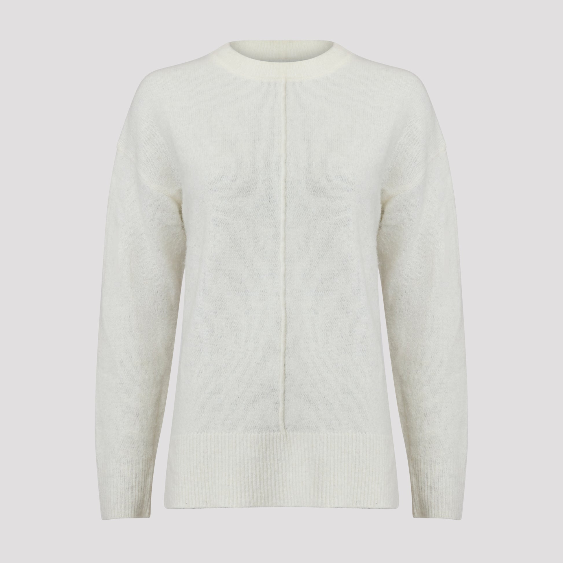 Mjuk, vit tröja med rund hals och söm framtill. Offwhite skön och tunnstickad tröja med ribb nertill och slitsar i sidan. Den vintervita tröjan är något längre bak än framtill och har en lätt nedhasad axel. Vår modell Charlene är 170cm och har storlek S på sig.