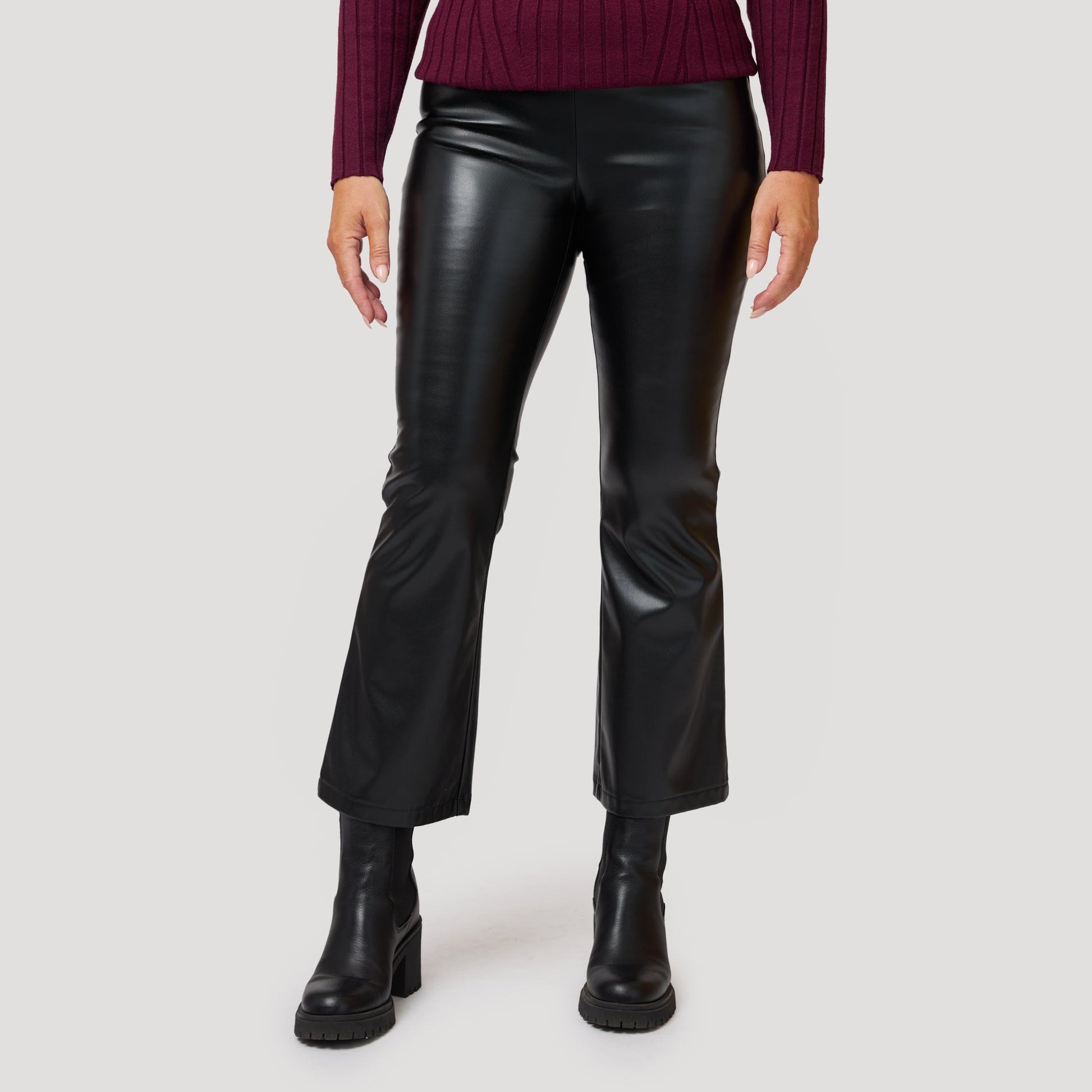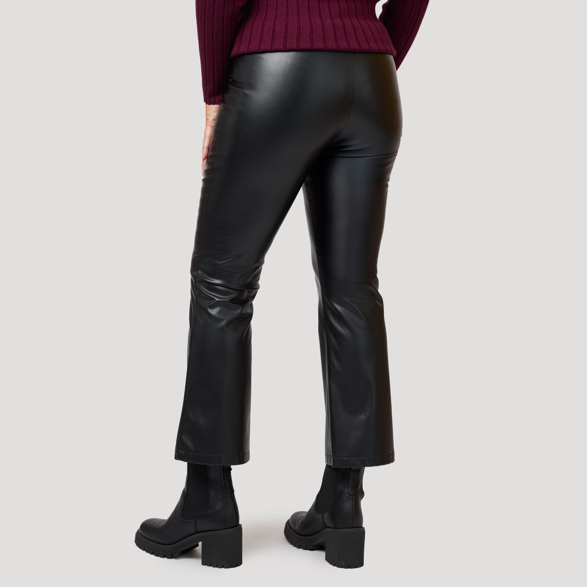 Svart, tuff byxa i stretchig läderimitation. Byxan är i kickflare modell med utsvängt kort ben och har resår i midjan. Denna byxa är påfylld och förbättrad från tidigare år och har nu en högre midja och sitter uppe bättre. Vår modell Marianne är 170 cm och har storlek S på sig.