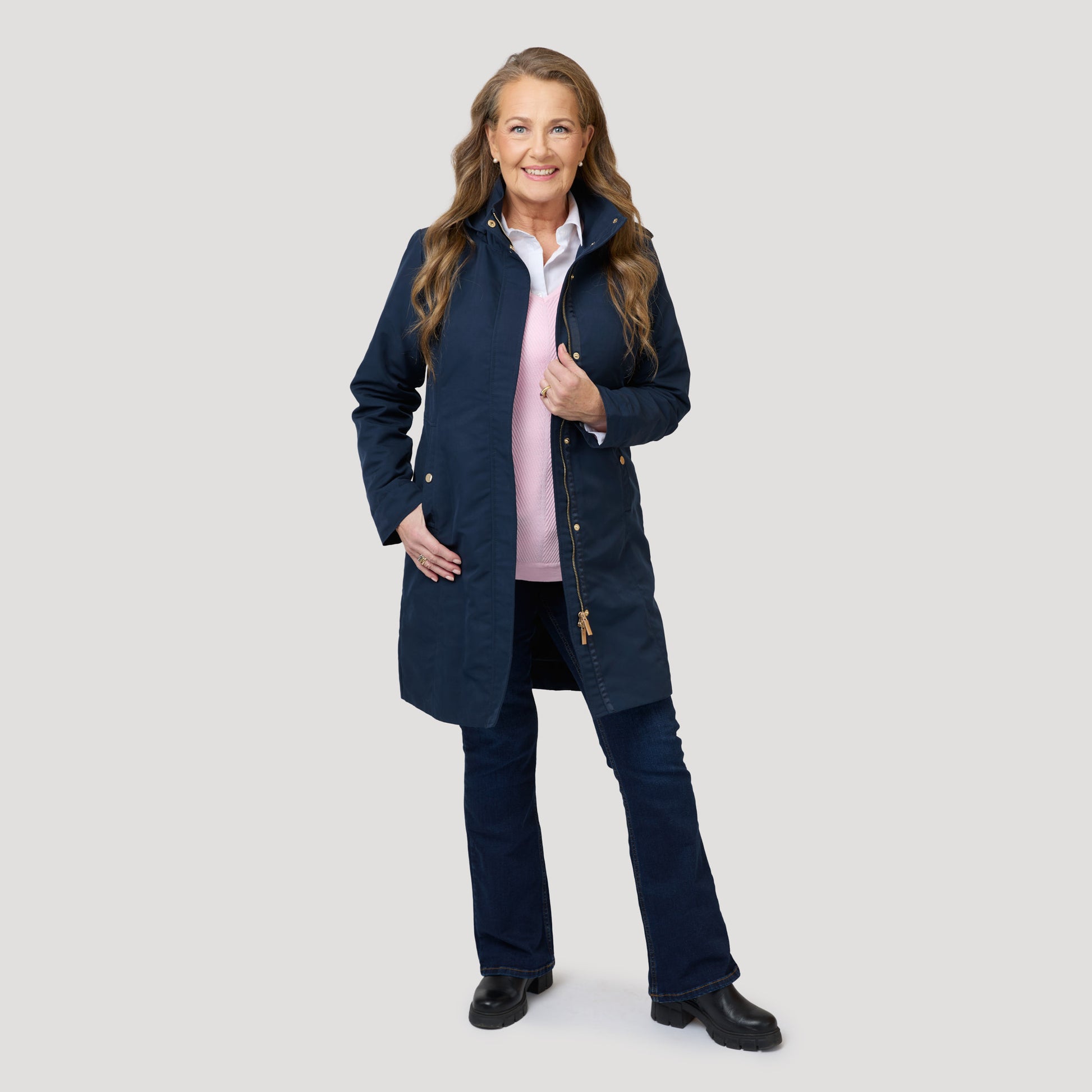 Rosa tröja under mörkblå jacka