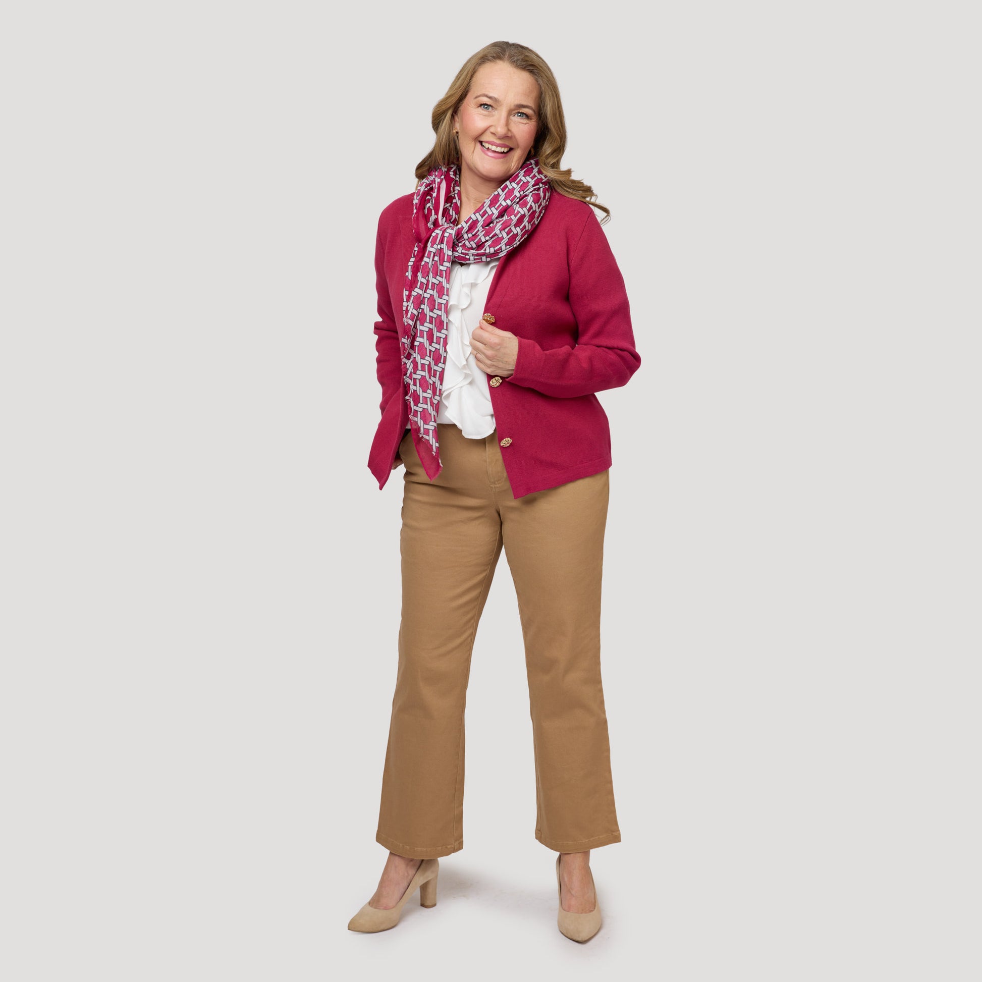 Luftig sval sjal i viskos och modal blandning med ett vackert mönster på hallonröd botten. Ett vackert tillägg till din outfit, passar perfekt till vår Jackie cardigan.