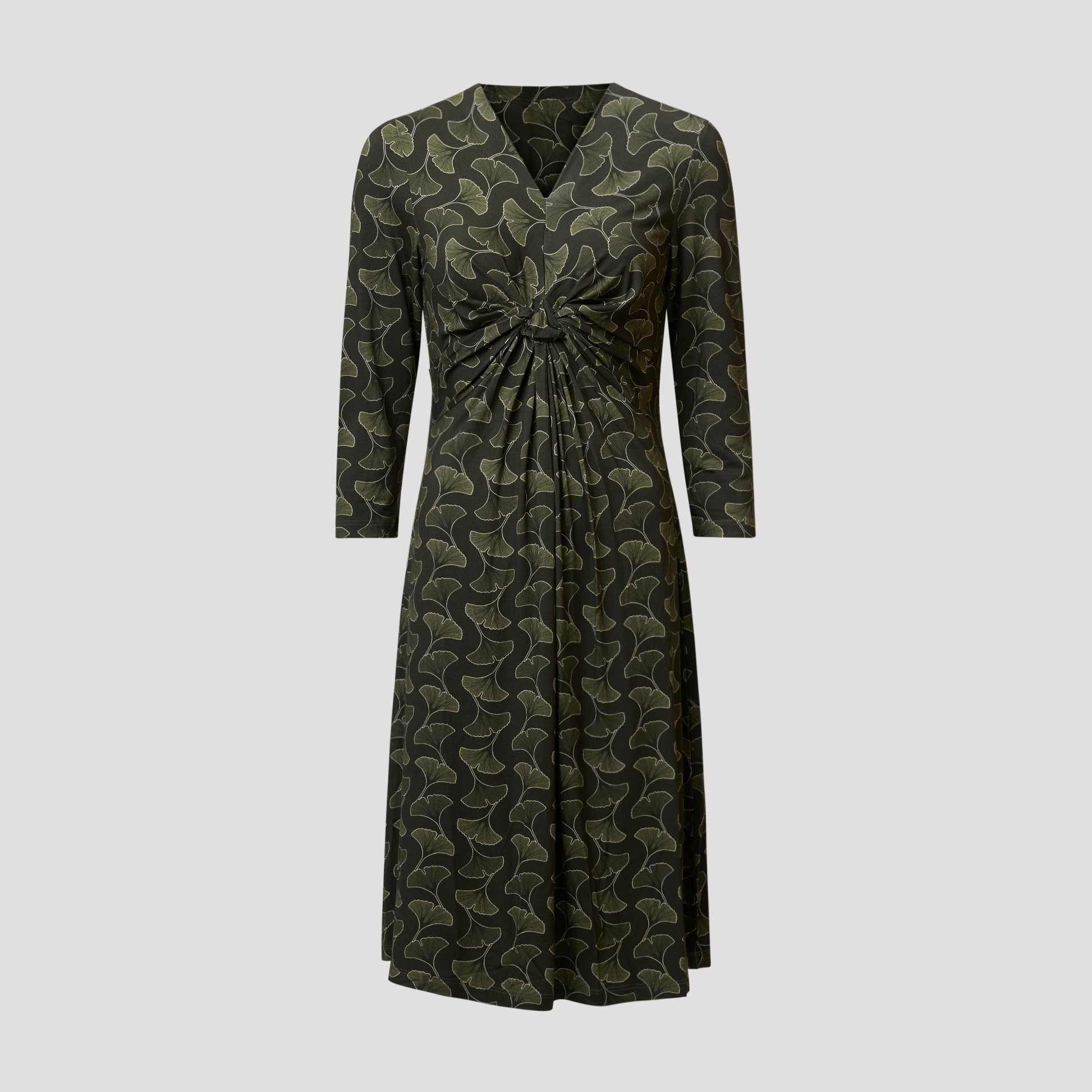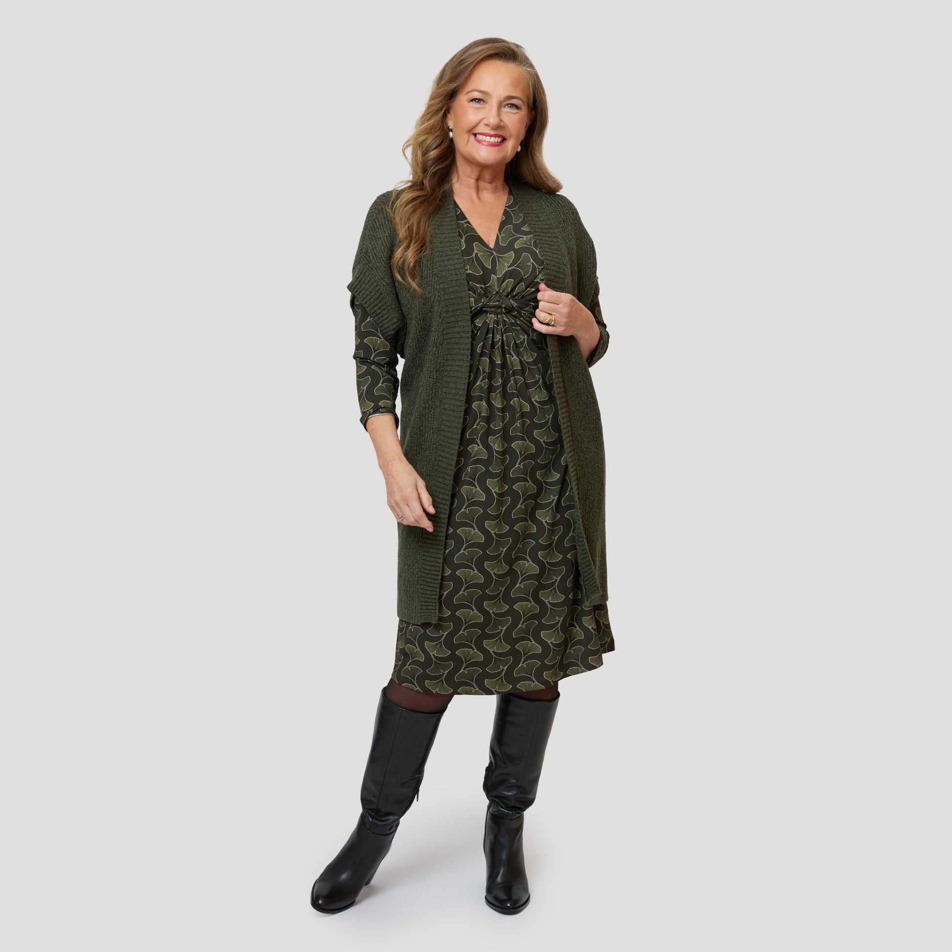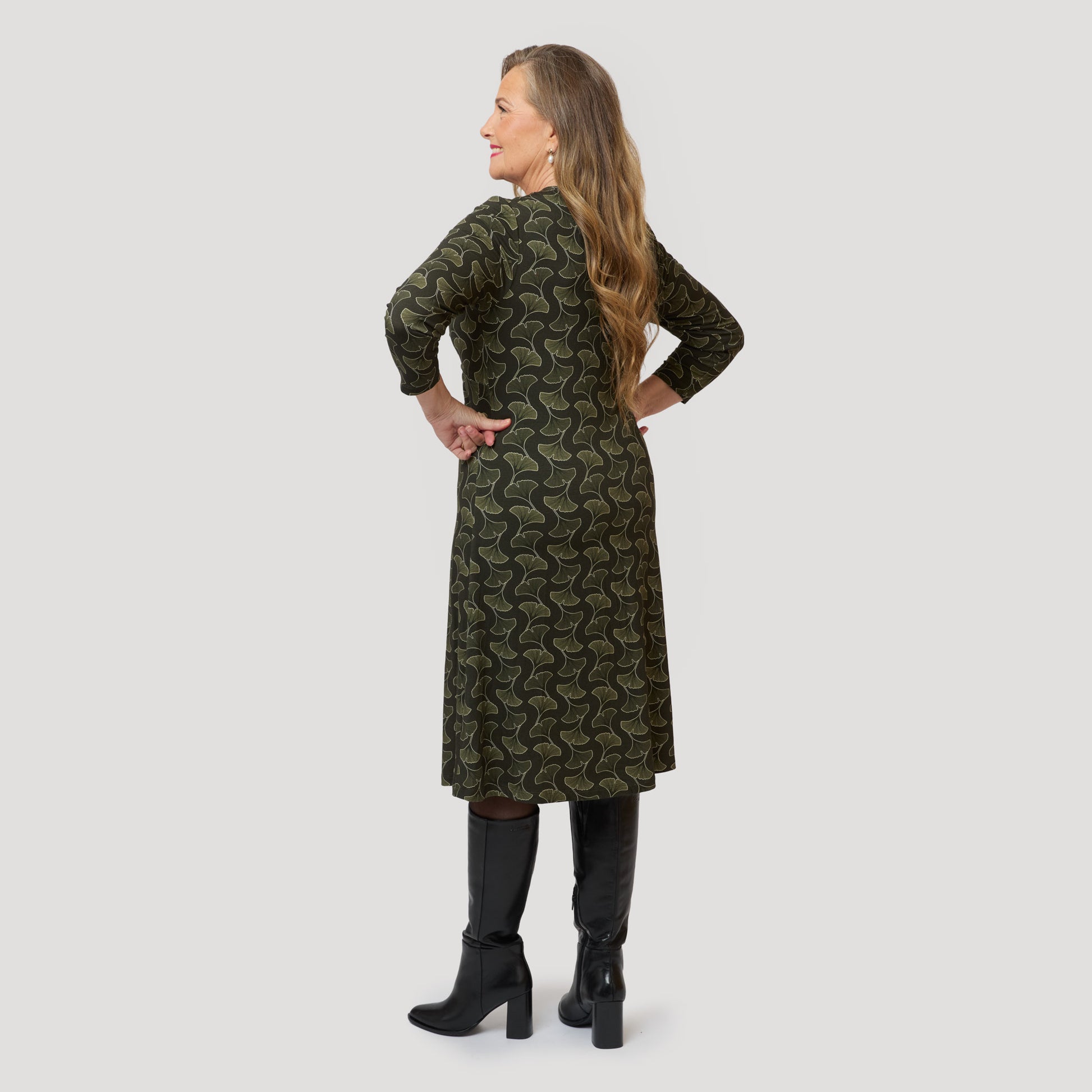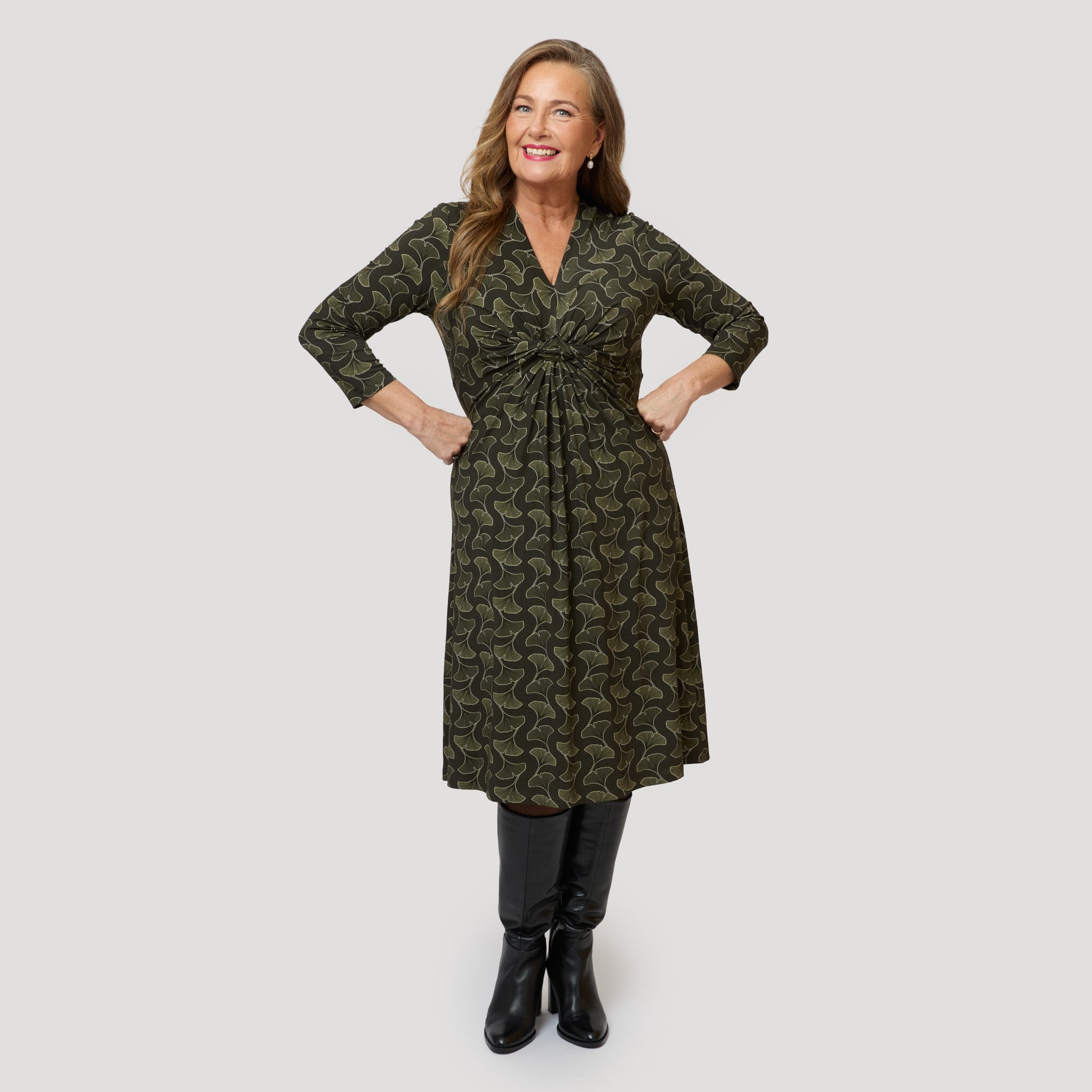 Skön trikåklänning i viskos med bladmönster i gröna toner. Klänningen är draperad under bysten för en väldigt smickrande passform som förvillar bort eventuellt extra fluff på magen. Klänningen är lik vår Smilla klänning men med längre ärm. Vår modell Yvonne är 170 cm och har storlek M på sig.