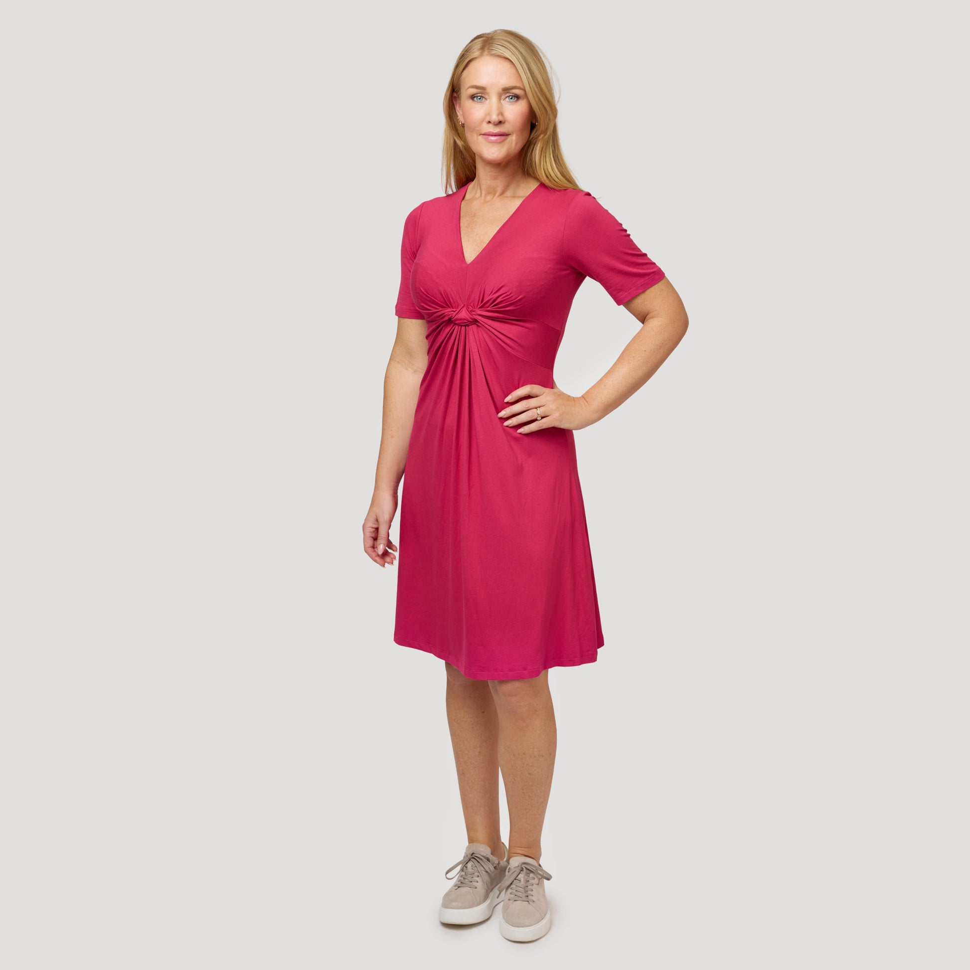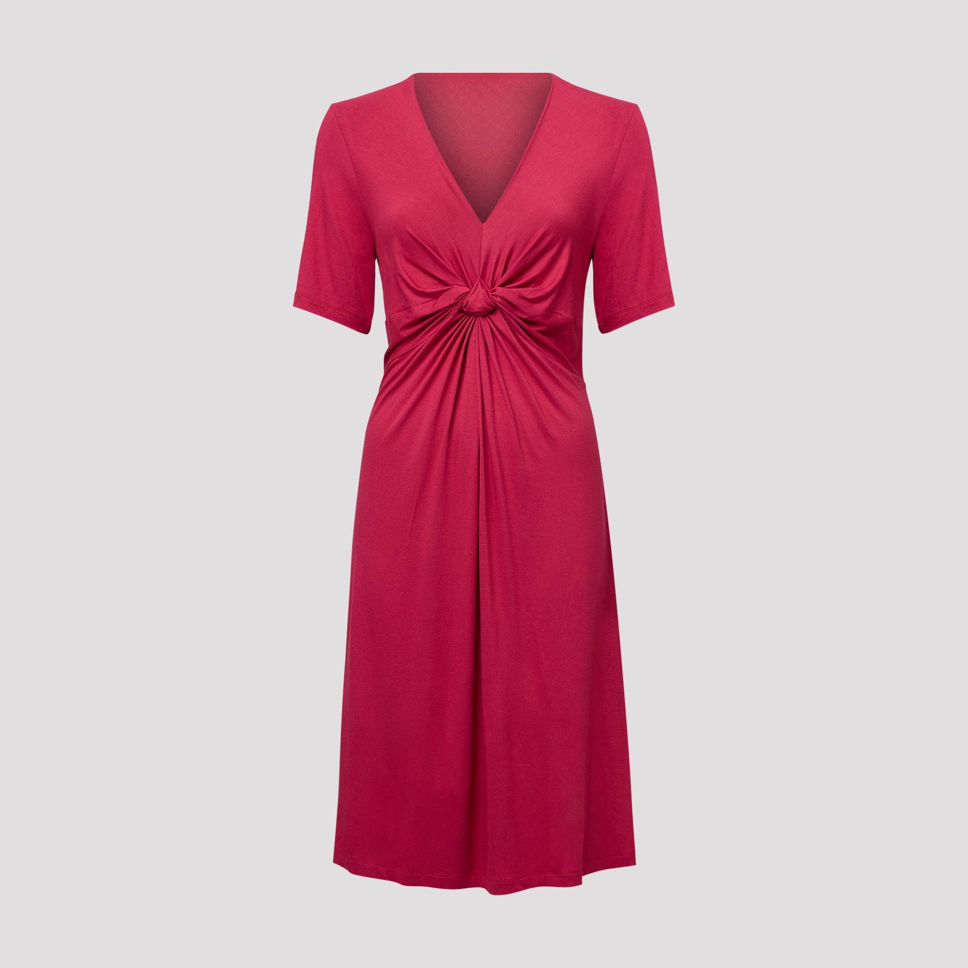 Hallonröd klänning i skön härlig viskos. Trikåklänning som är draperad under bysten för en väldigt smickrande passform. Klänningen är lik vår Sasha klänning men har en kortare ärm. Vår modell Marianne är 173 cm och har storlek S på sig.