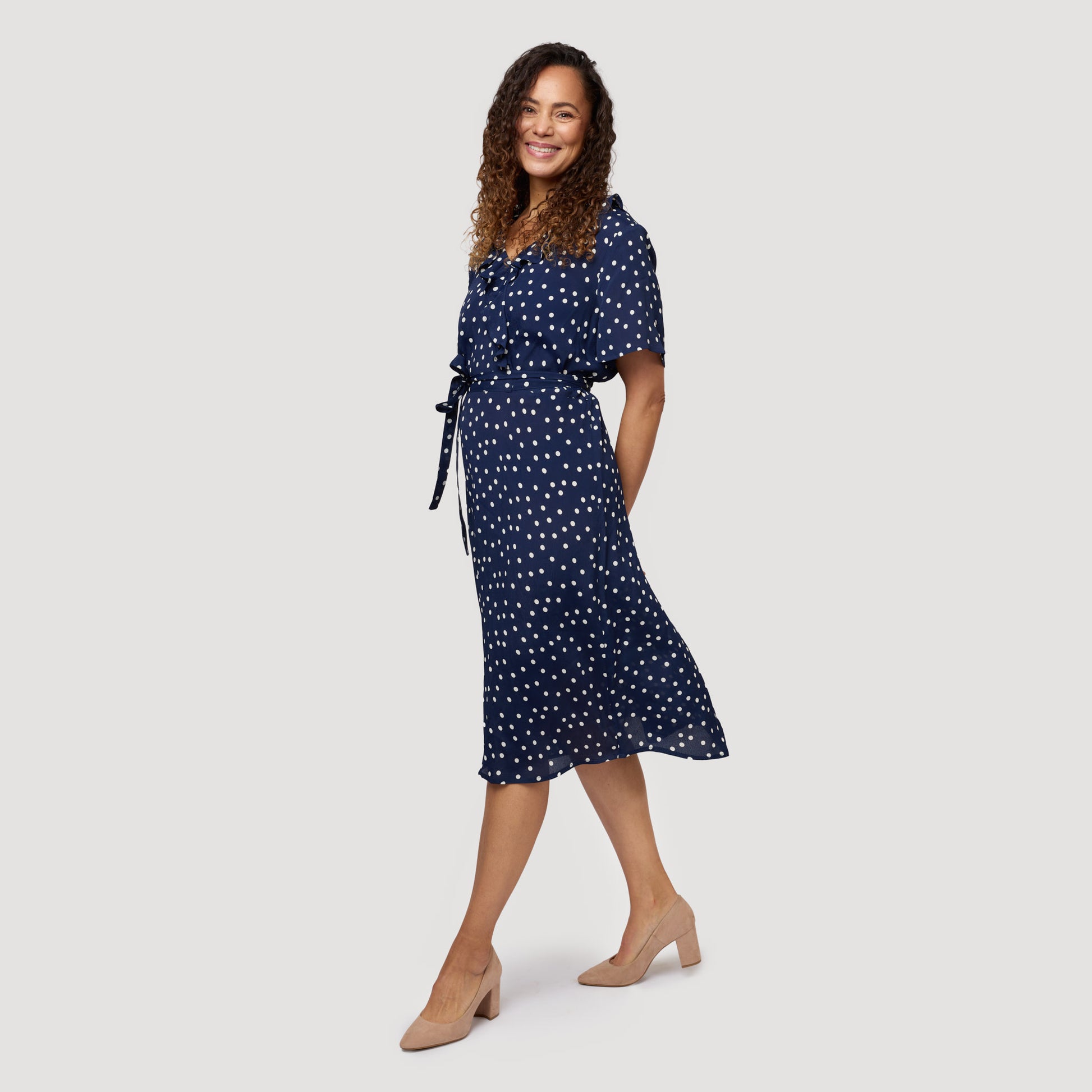 Prickig V-ringad klänning med mörkblå botten med mönster i offwhite. Sval omlottklänning i 100% viskos med volanger där omlotten är hopsydd mitt fram. Sommarklänning med kort ärm som har knytband från avskärning mitt fram. Vår modell Charlene är 170cm och har storlek S på sig.