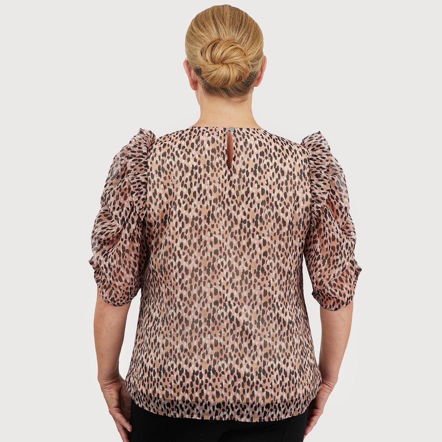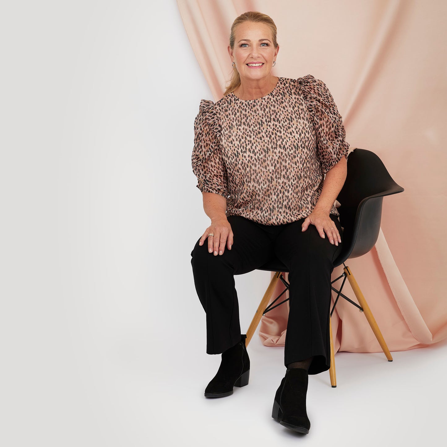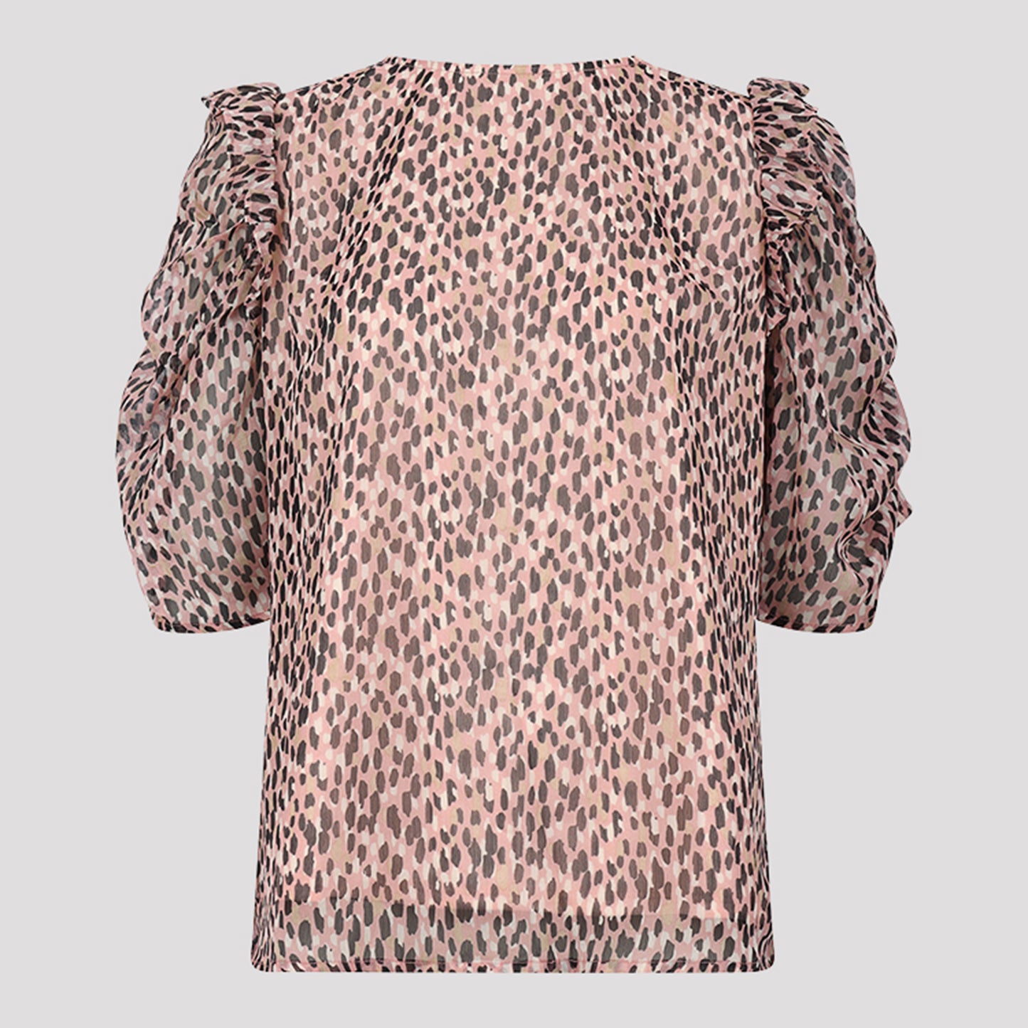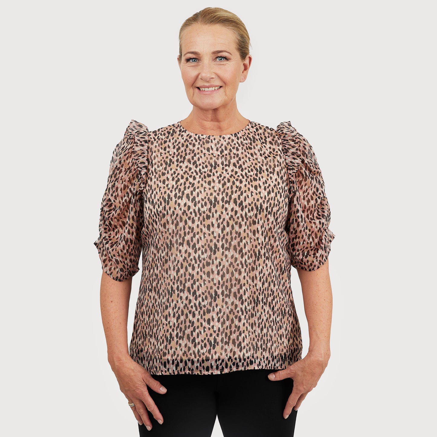 Festblus med puffärm i luftig kvalitet med rosa och svarta fläckar. Blusen har ett tunt foder men är genombruten på ärmarna. Puffärmen har flera rynkor för extra volym. Vår modell Yvonne är 170 cm och har storlek M på sig. Blus från Rosebud.