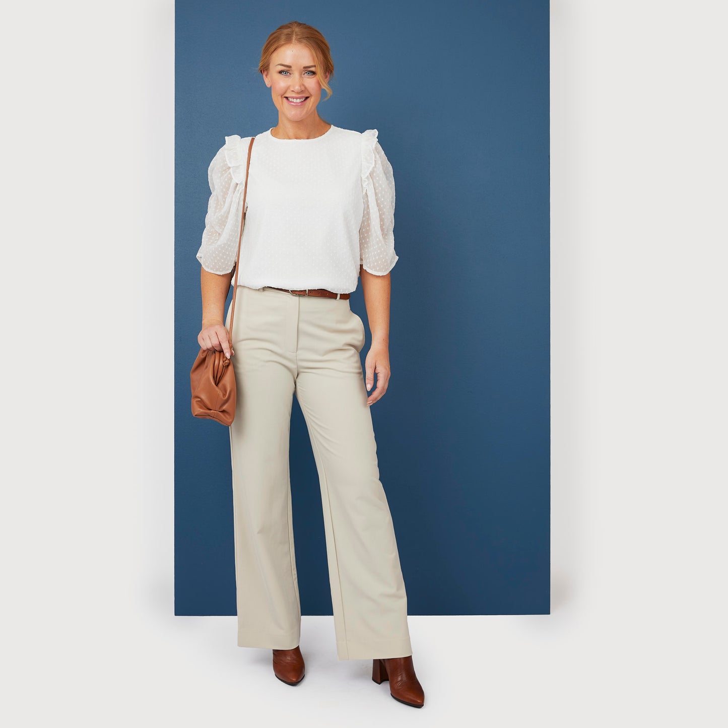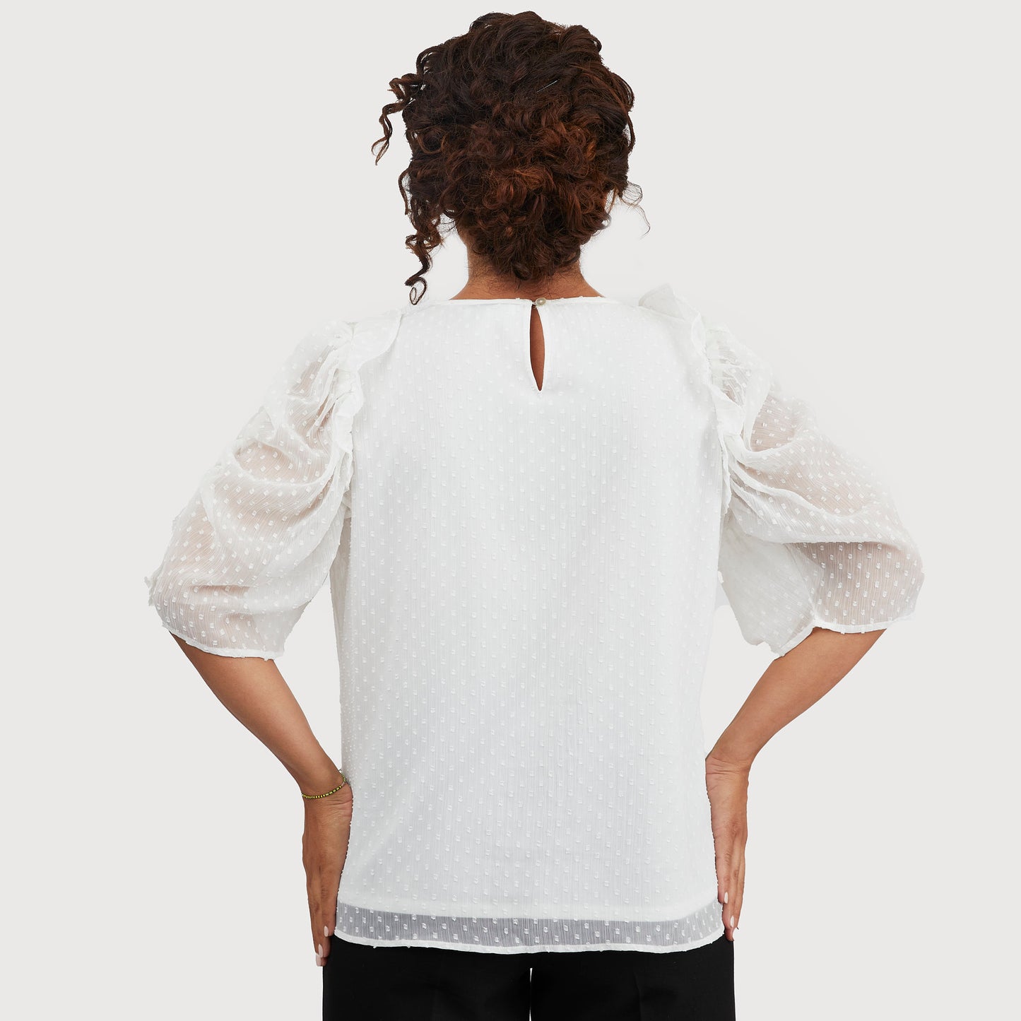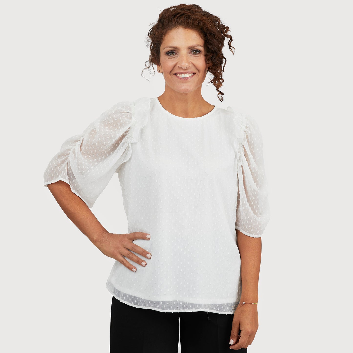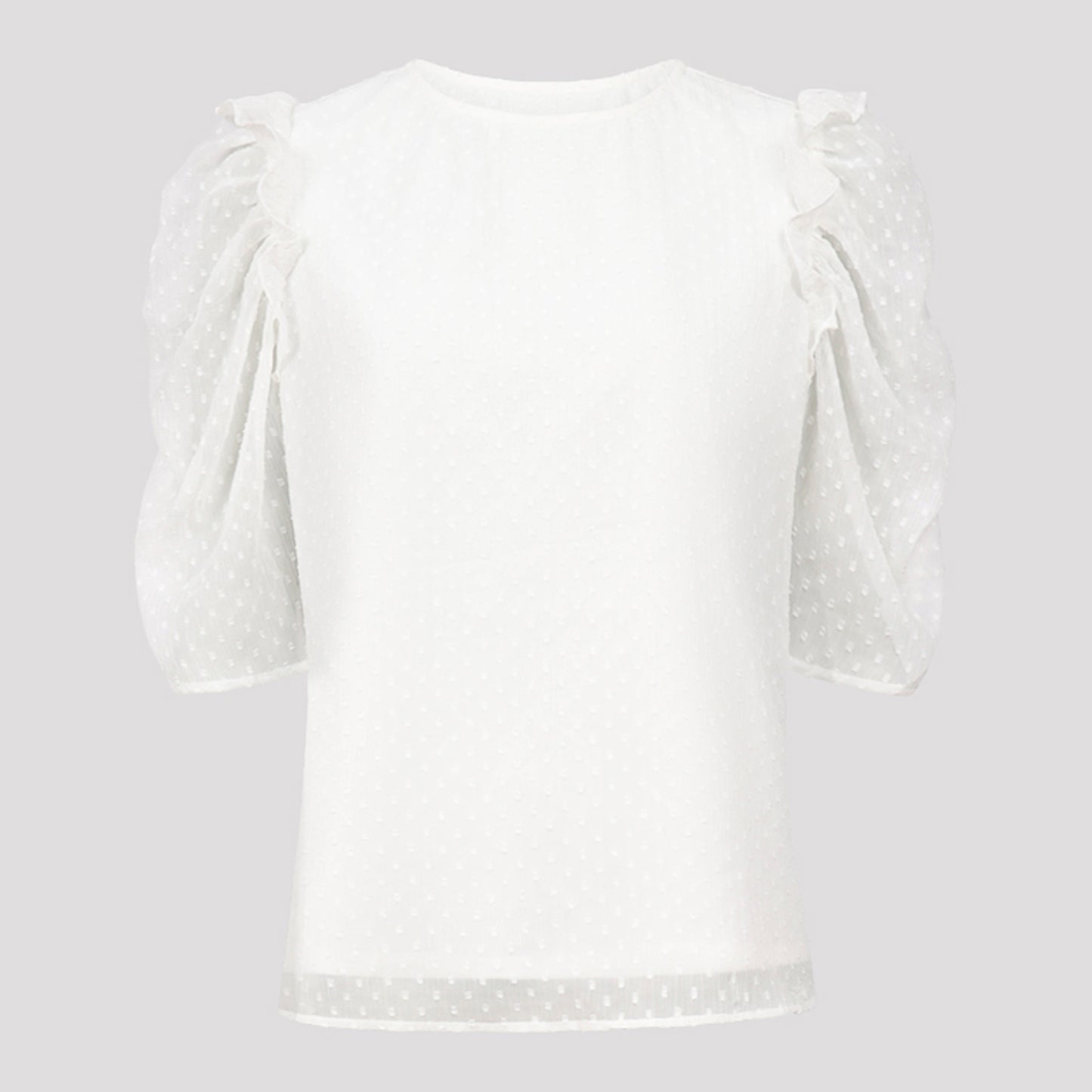 Vit, festblus med puffärm i luftig kvalitet med väva prickar. Blusen har ett tunt foder men är genombruten på ärmarna. Puffärmen har flera rynkor för extra volym. Vår modell Yasmine är 163 cm och har storlek M på sig. Blus från Rosebud.