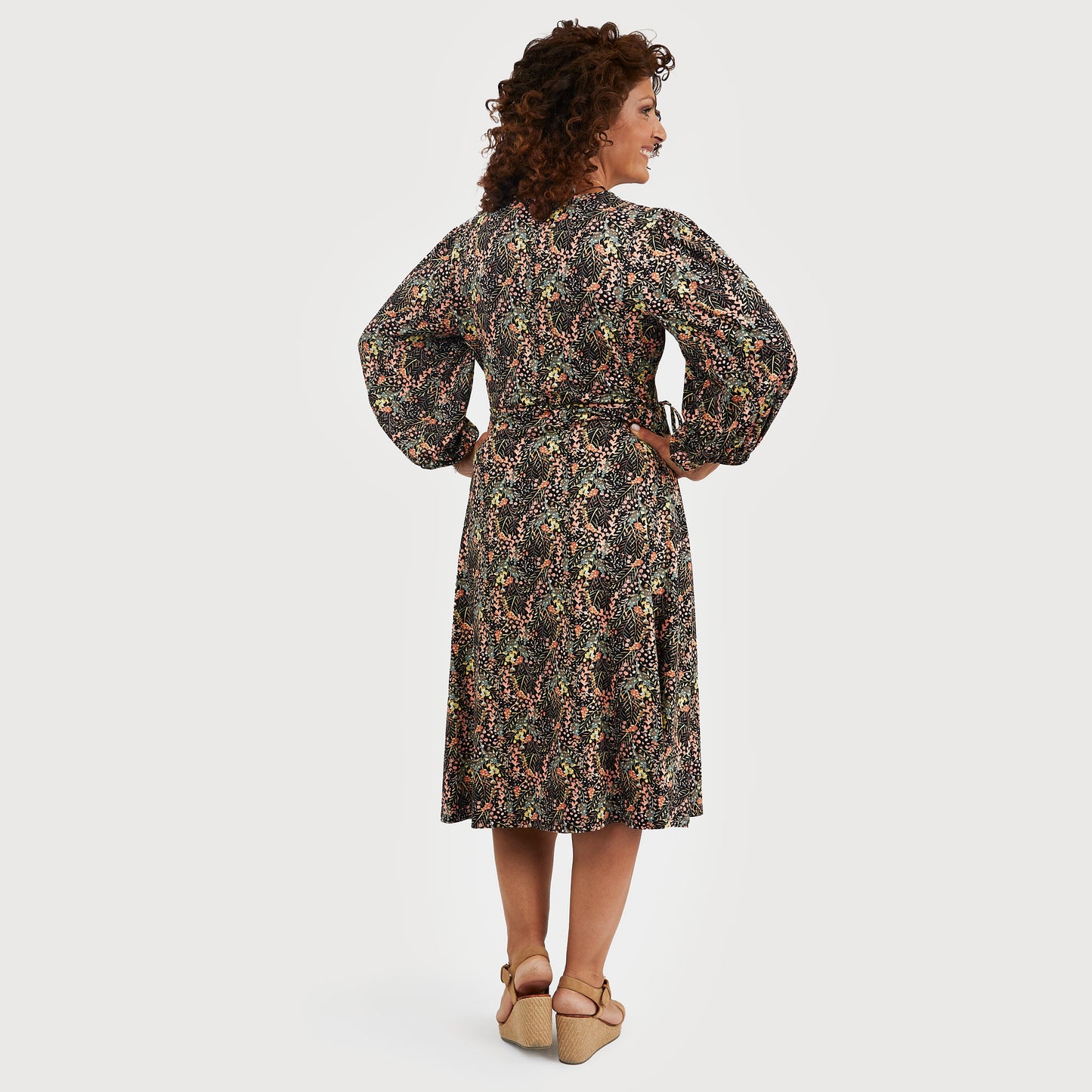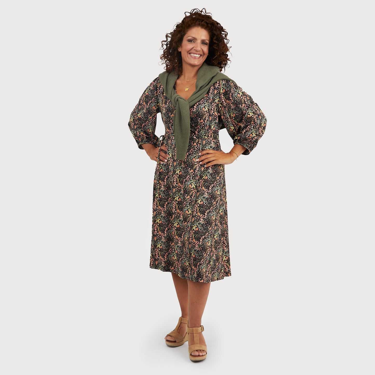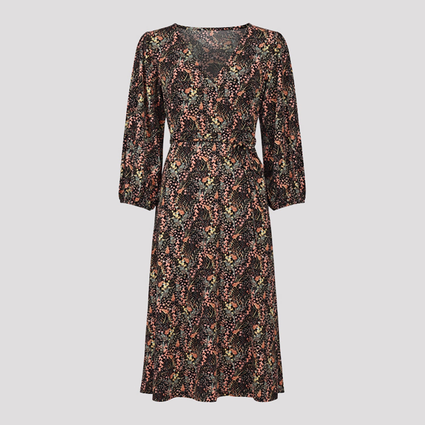 Blommig omlottklänning med knytband i midjan. Den snygga v-ringade klänningen har en lång puffärm och vid kjol. Den långärmade klänningen är av stretchigt trikåmaterial. Klänning från Rosebud. Vår modell Yasmine är 163 cm och har storlek S på sig.