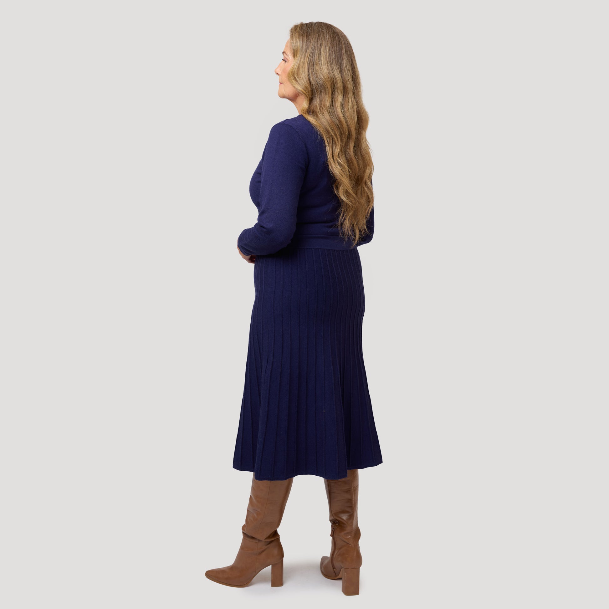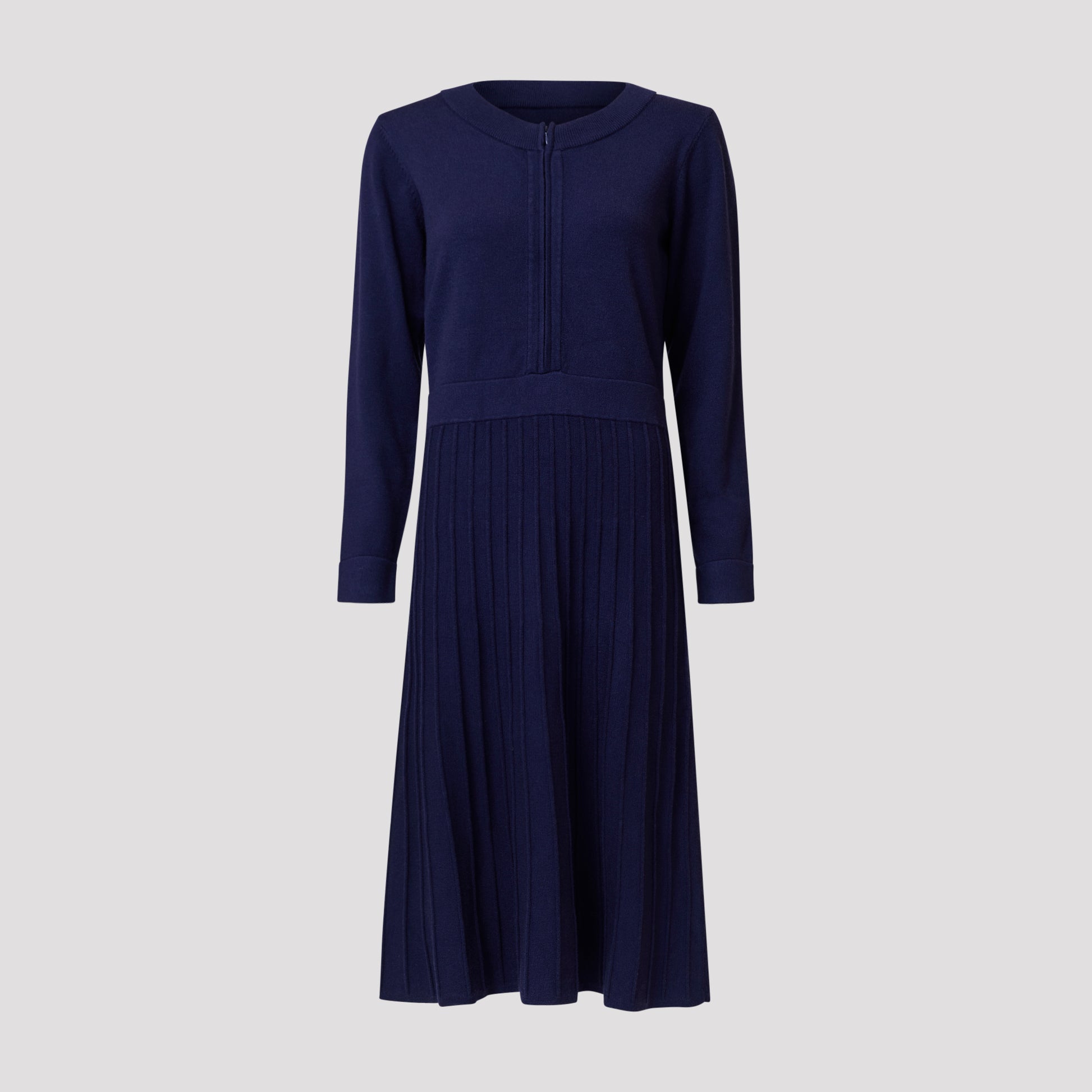 Stickad klänning med smickrande passform och lång ärm. Mjuk mörkblå klänning med en A-linjeformad kjol och dragkedja framtill så att man själv kan reglera halsdjupet. Klänningen är slätstickad upptill med breda muddar i midjan, ärmslutet och halsen. Stickningen på kjolen ger plisserad form. Vår modell Yvonne är 170 cm och har storlek S på sig.