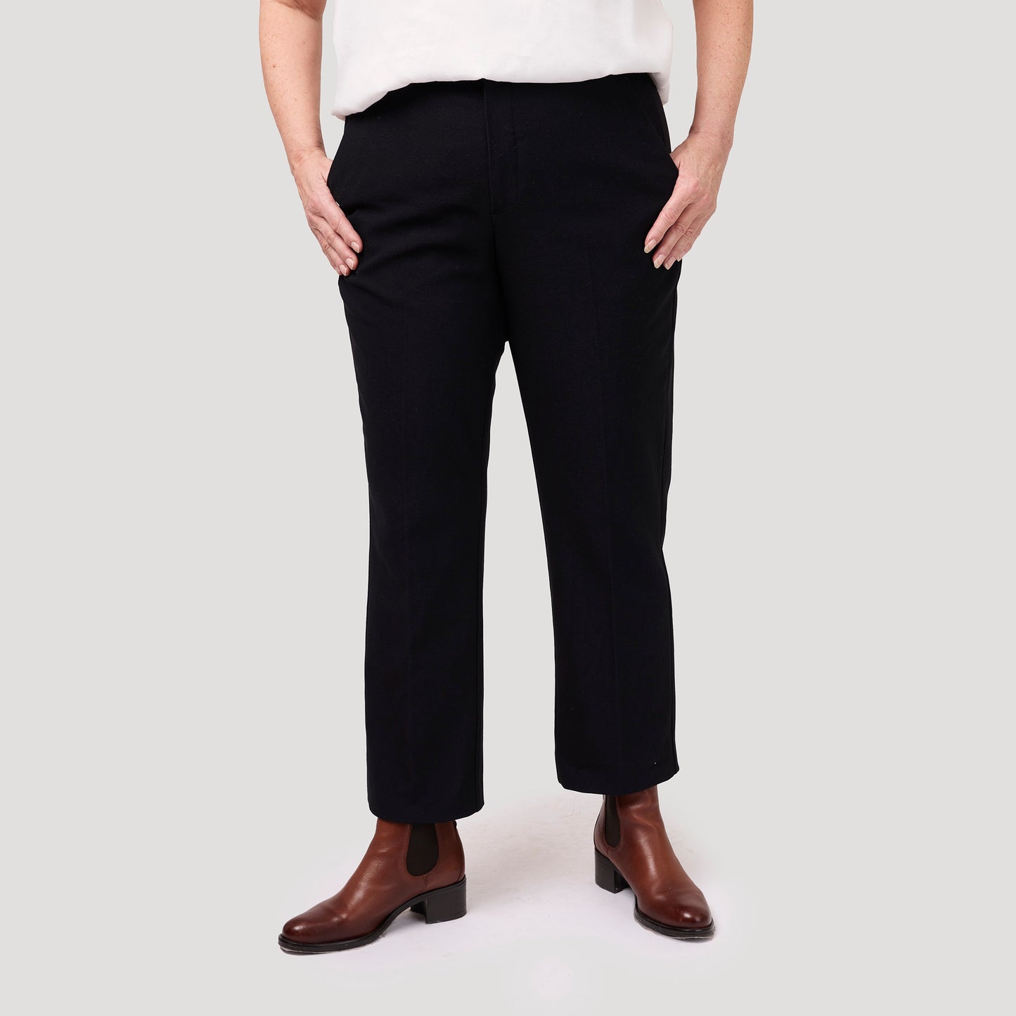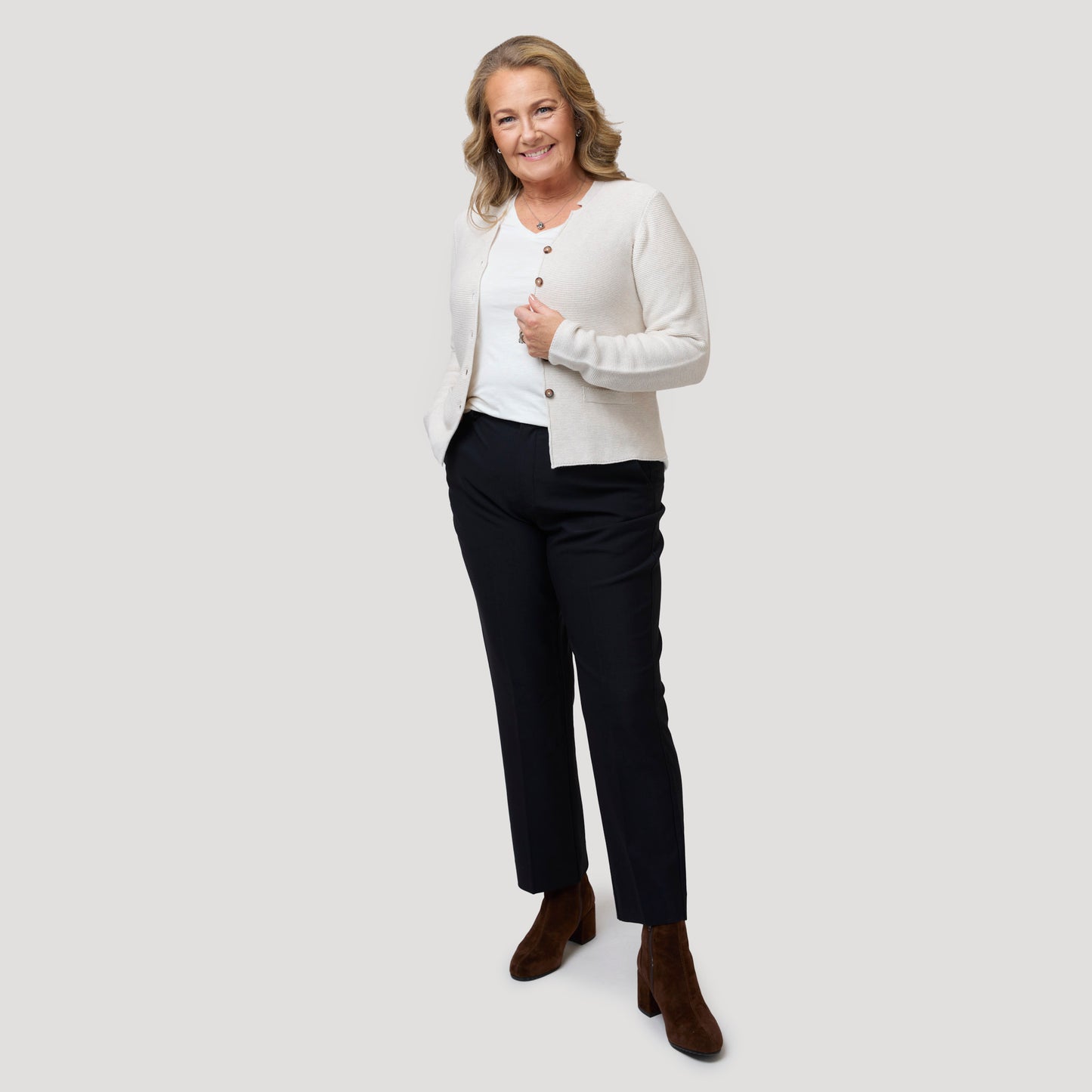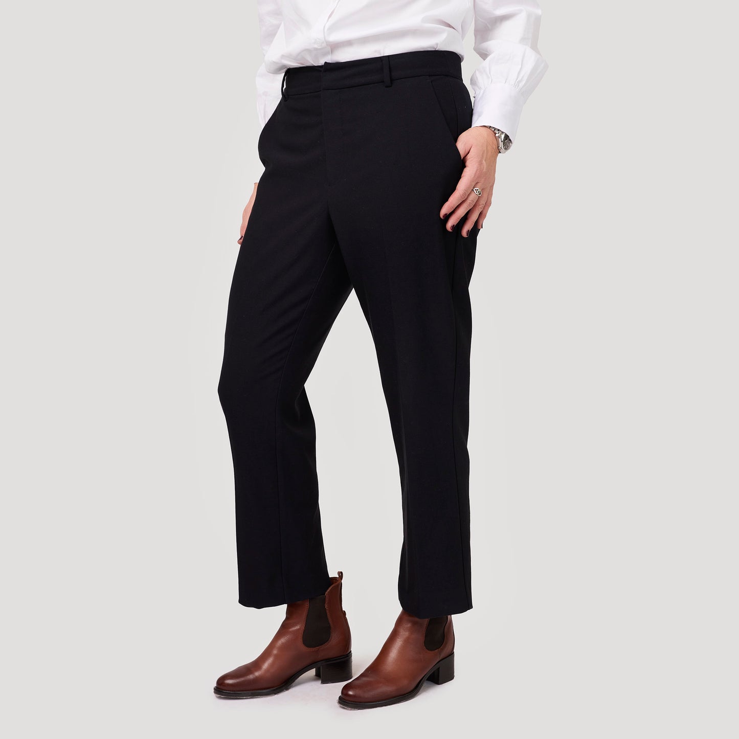 Mörkblå byxa i en skön, mjuk kvalitet. Den snygga stretchbyxan i navy har även resår i linningen baktill för bra passform vilket gör den extra skön. En klassisk modell med sidfickor, stolpfickor bak med knapp och pressveck fram och bak. Stängs med gylf med dragkedja, hyska och hake i linningen. Tyget är samma kvalitet som i vår tidigare modell Anita byxa. Vår modell Anne är 174 cm och har storlek 40 på sig på bild 1. Vår modell Yvonne på bild 2 & 3 är 170 cm och har storlek 42 på sig. Byxa från Rosebud.