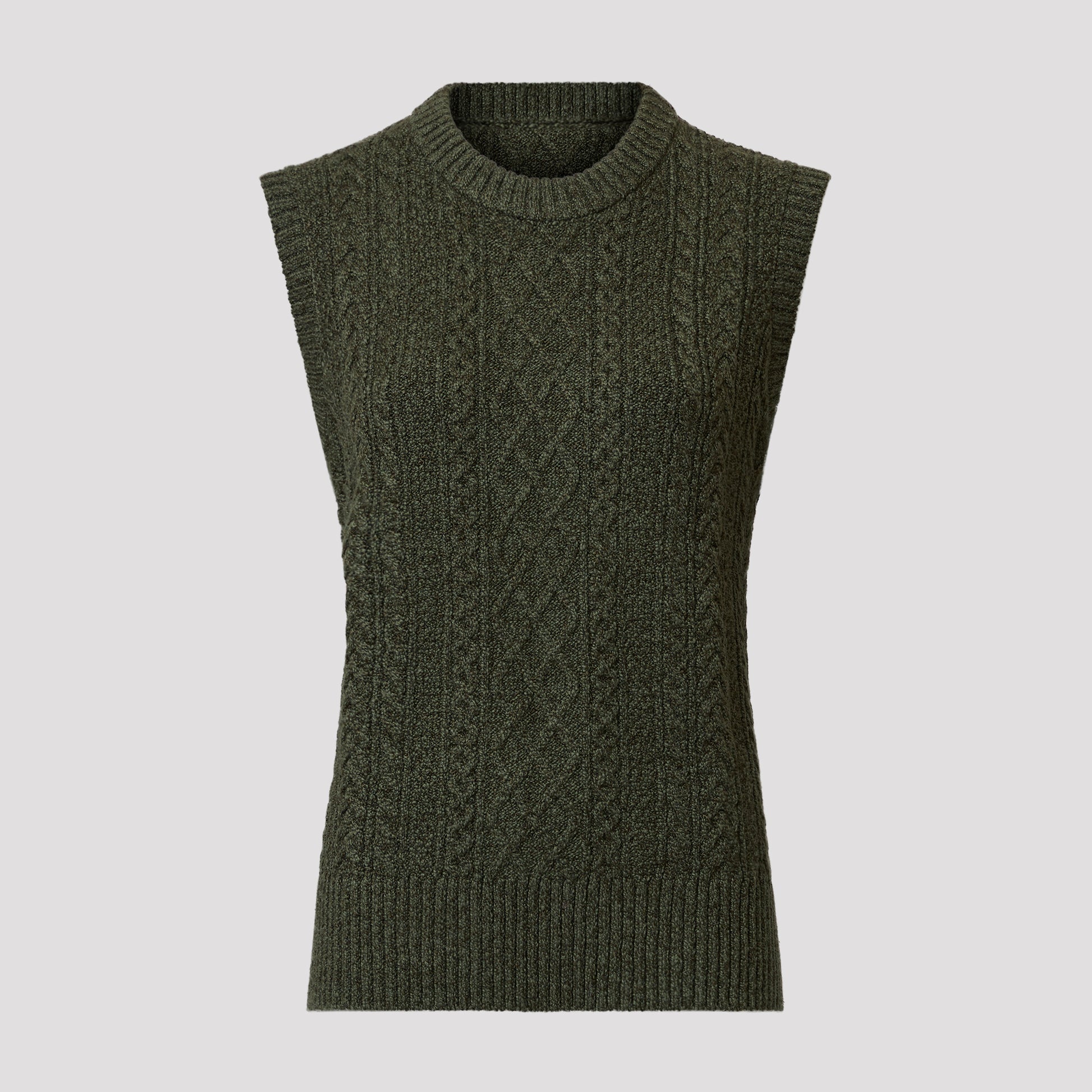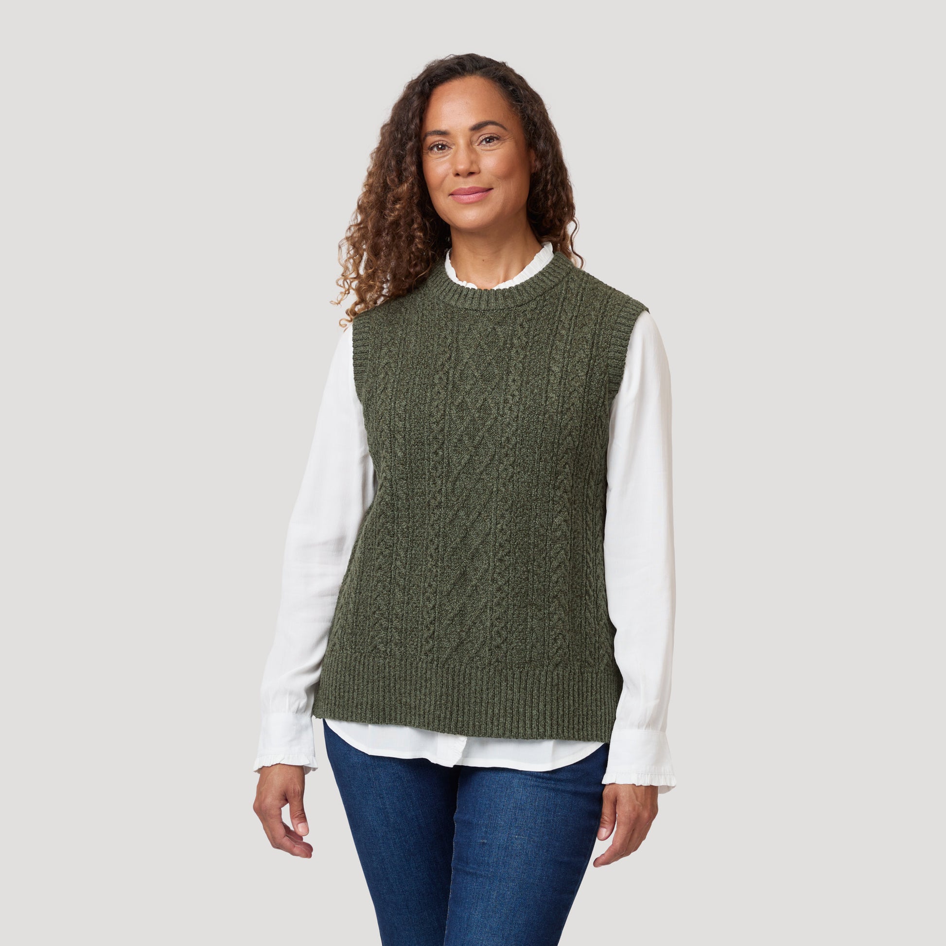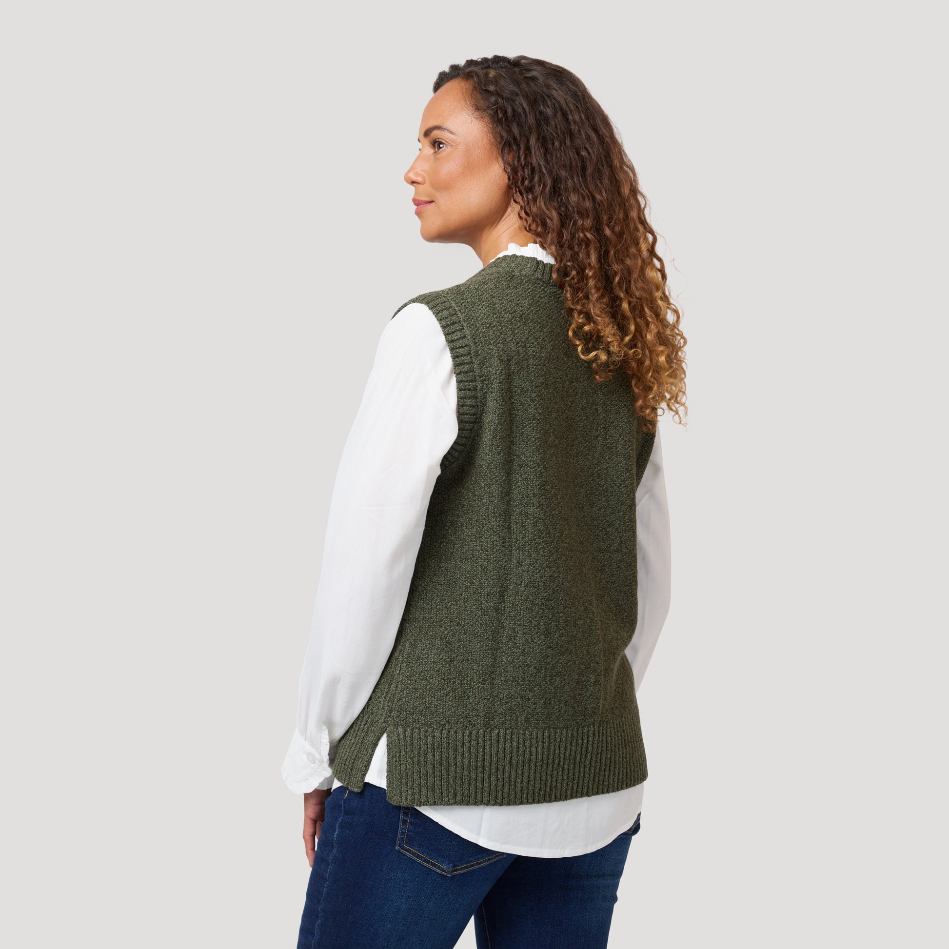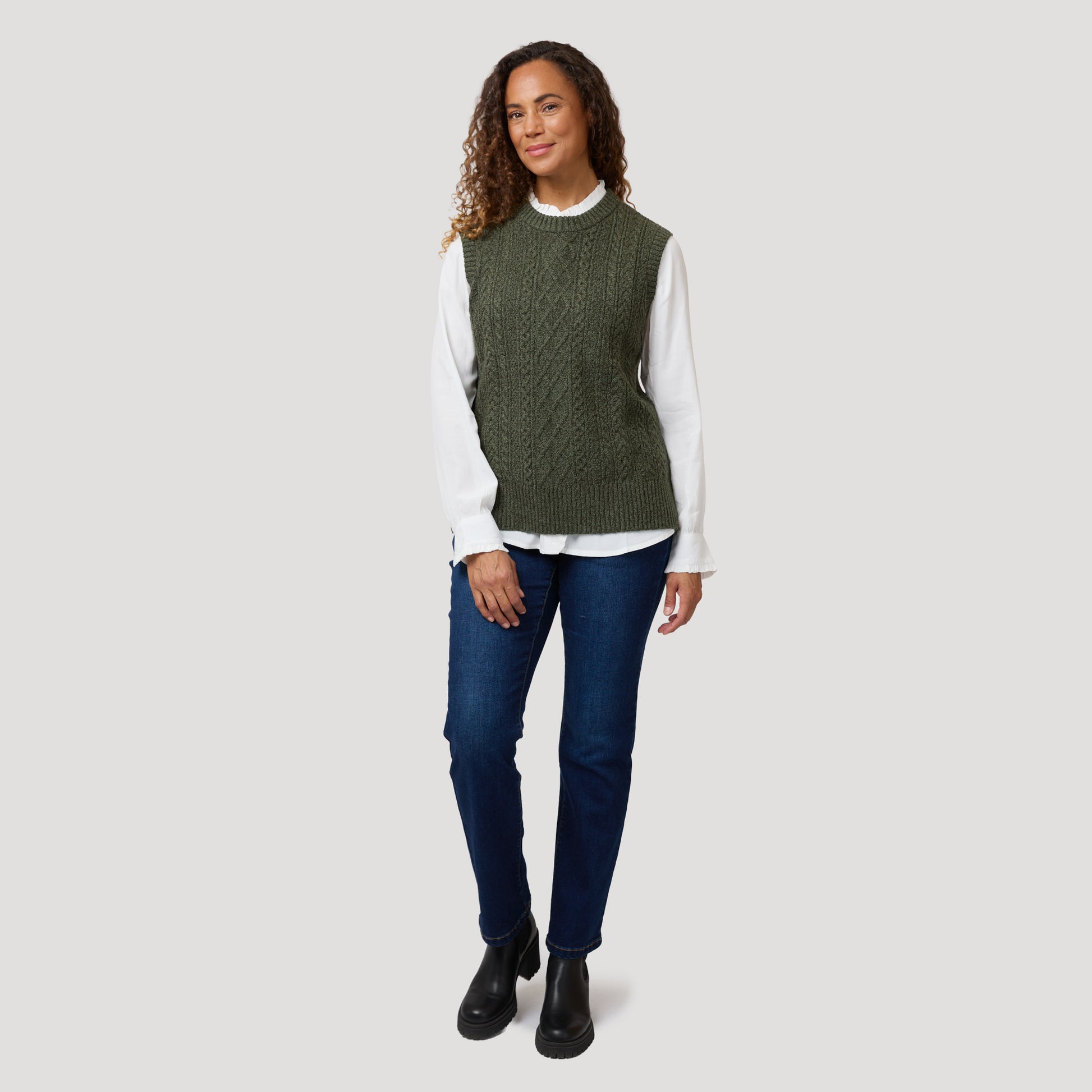 Mörkgrön väst med rund hals och flätor framtill. En kort mjuk väst i blandmaterial med bomull. Den gröna västen har slitsar i sidorna och ribbstickning i hals, ärmhål och nederkant. Vår modell Charlene är 170cm och har storlek S på sig.
