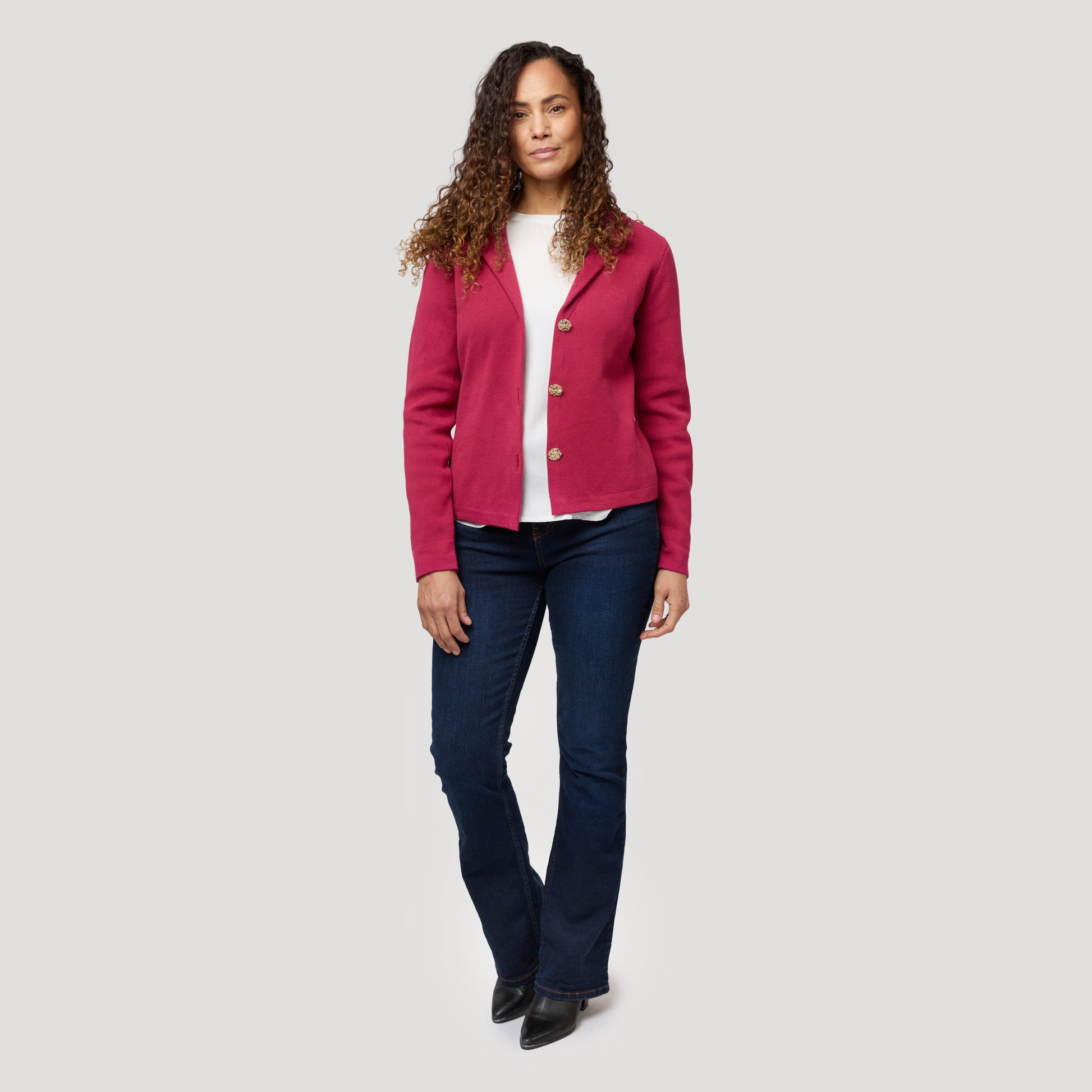 Vit blus under stickad kavaj i hallonrött