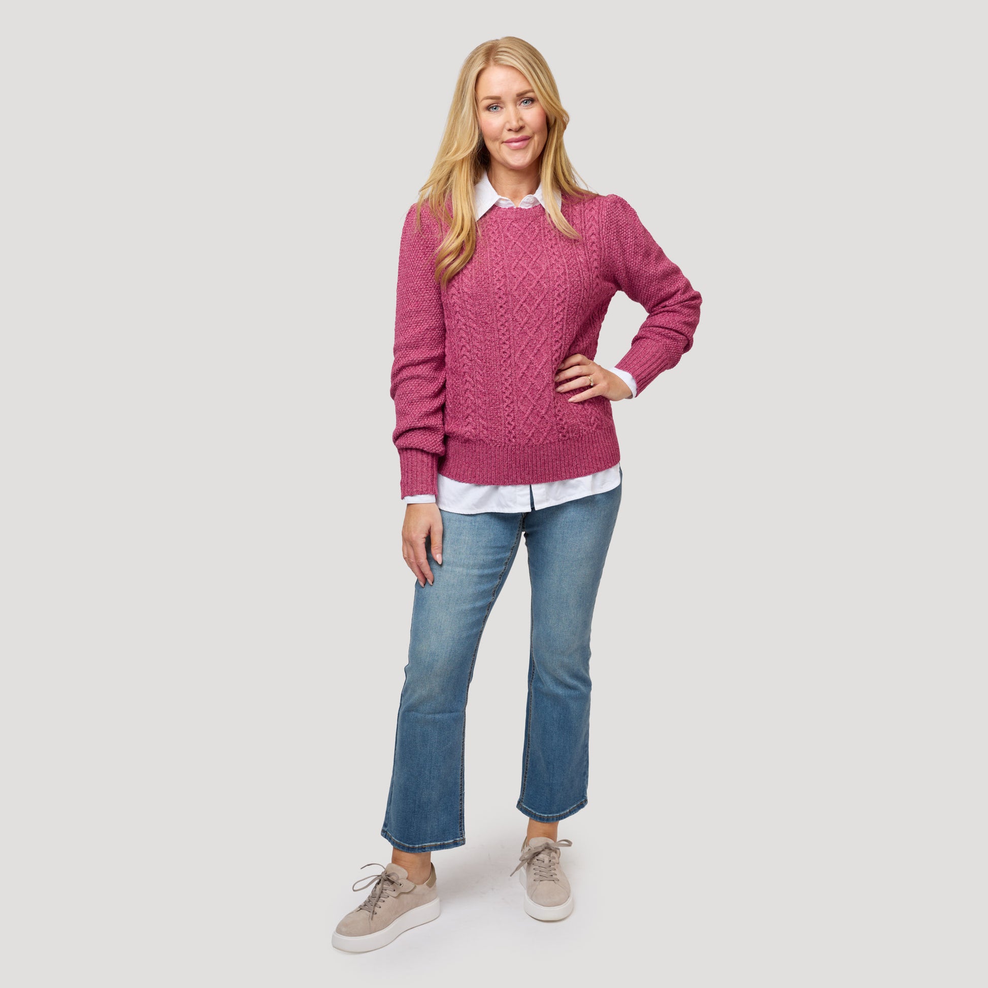 Vit skjorta under hallonrosa kabelstickad tröja