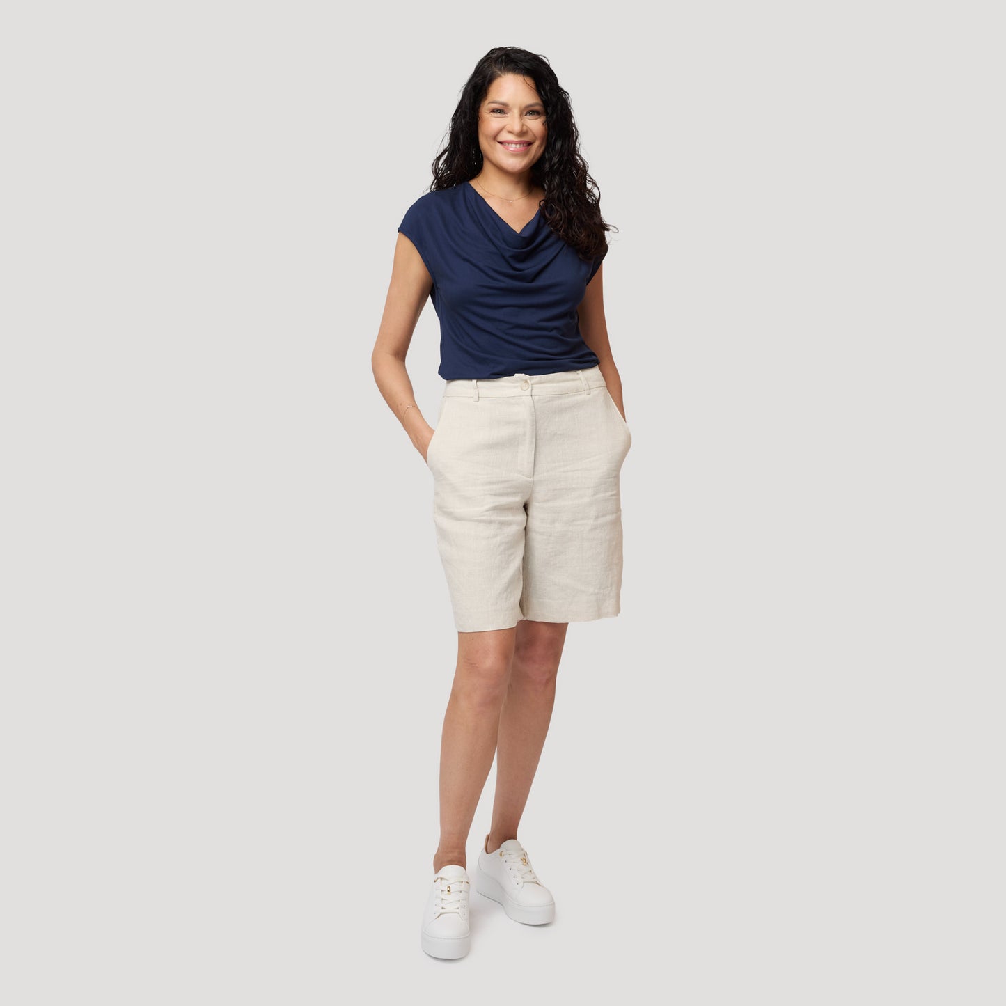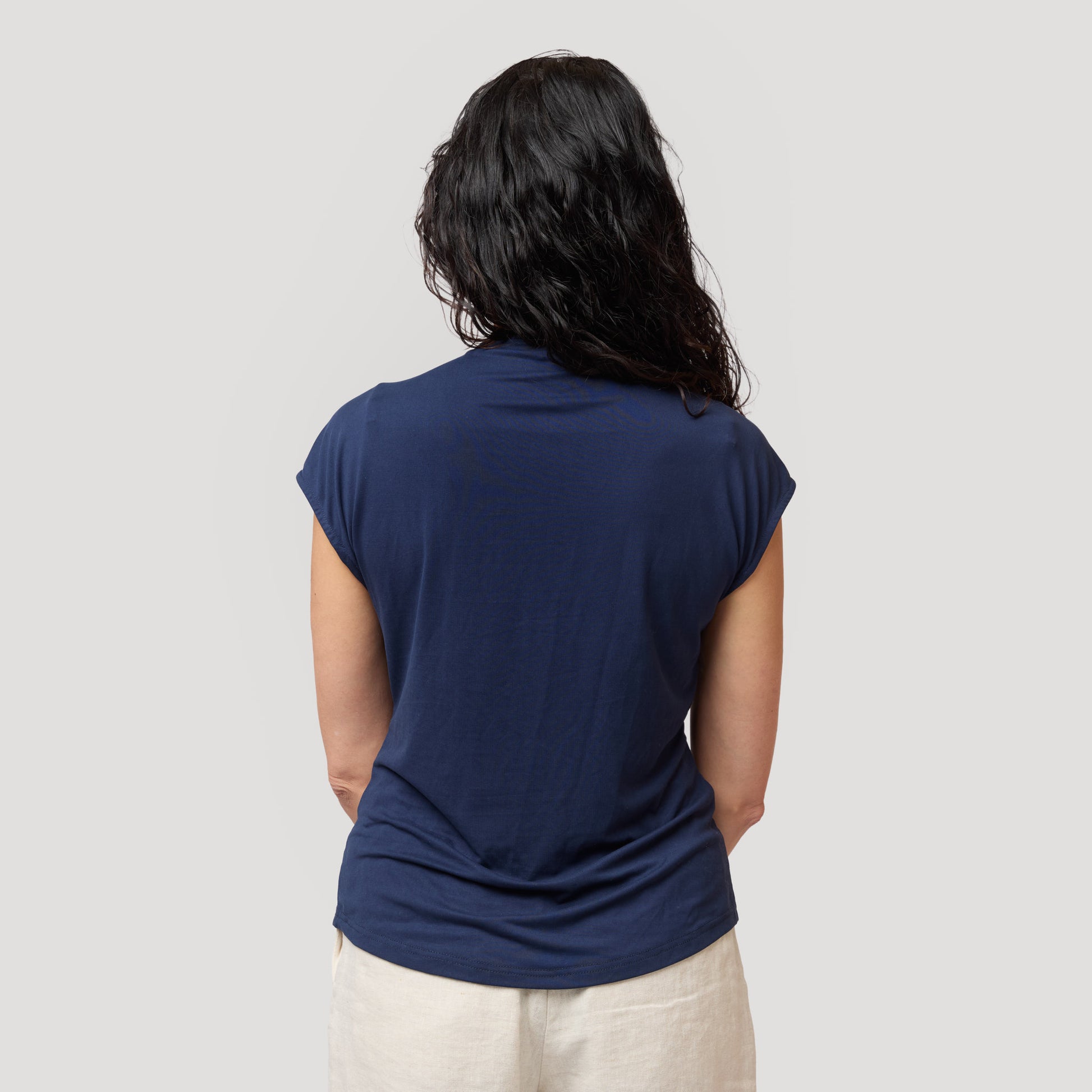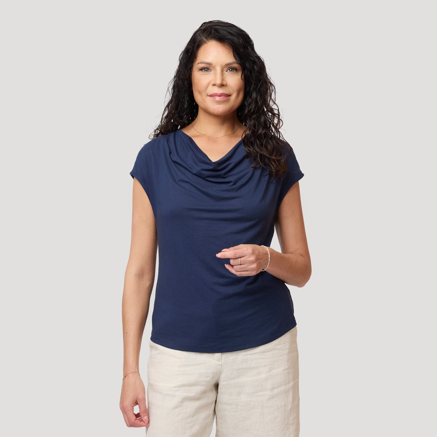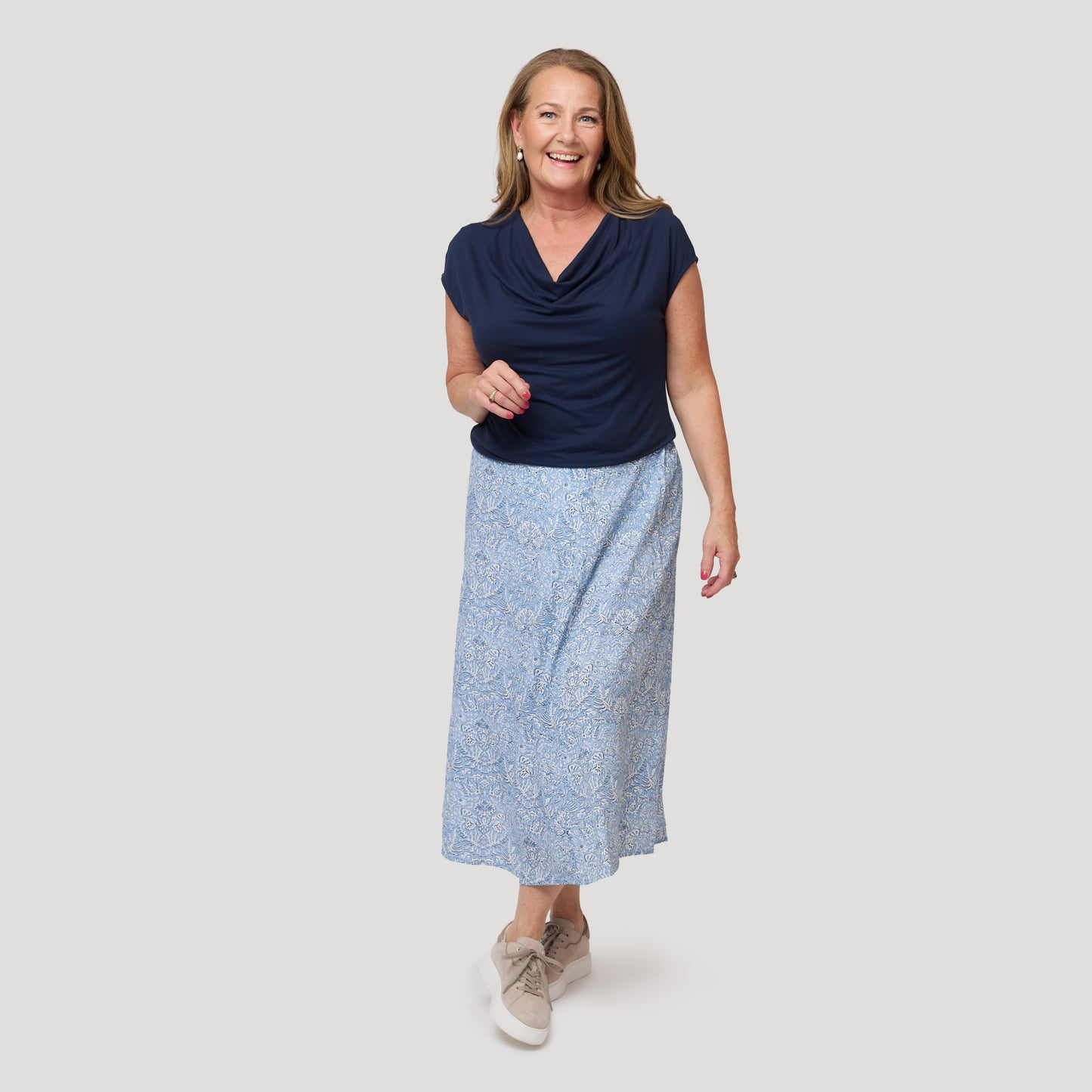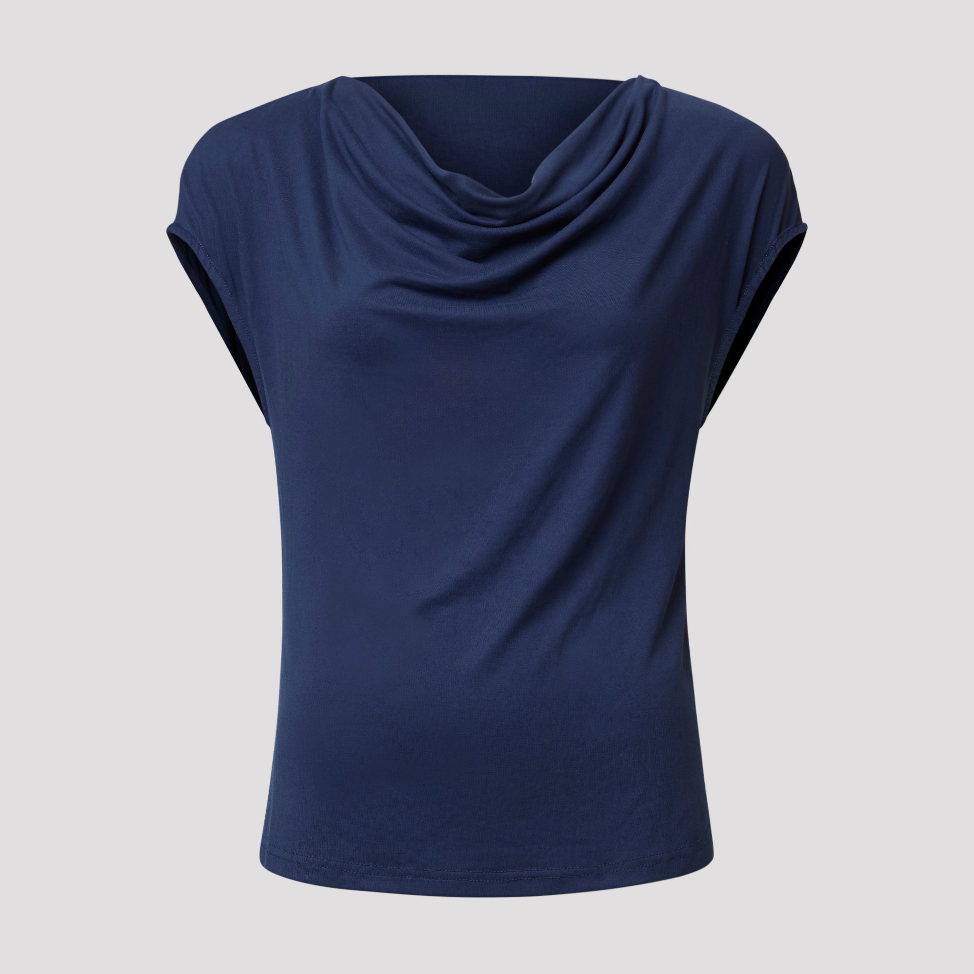 Blå, draperad topp med kort ärm. Snygg användbar topp både till fest och till vardags. Mörkblå trikåtopp med vattenfalls urringning som ger plagget en mer flexibel passform, ifall du vill bära den mer kroppsnära så kan du ta en storlek mindre än du brukar välja. Vår modell Jessica är 171cm och har storlek S på sig.