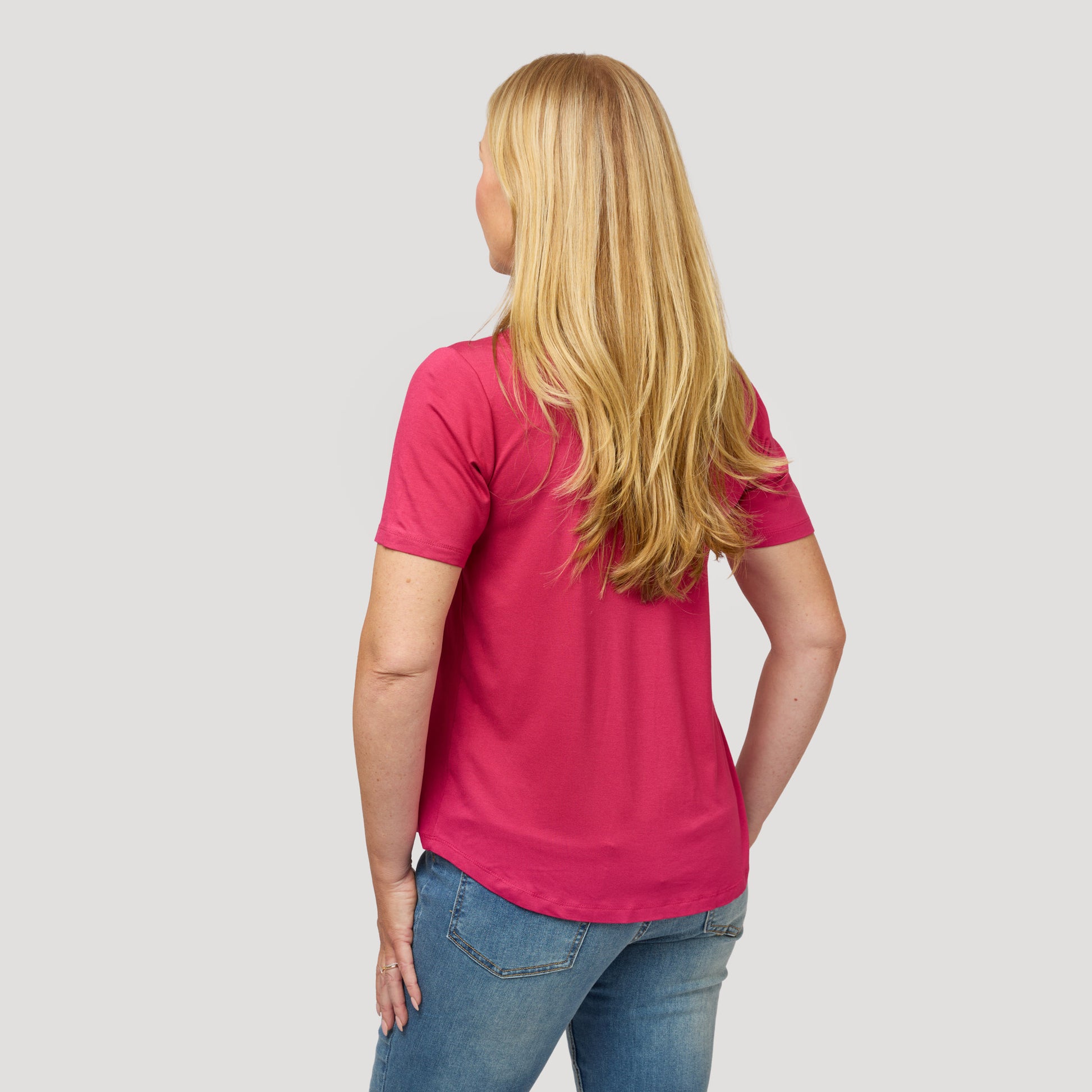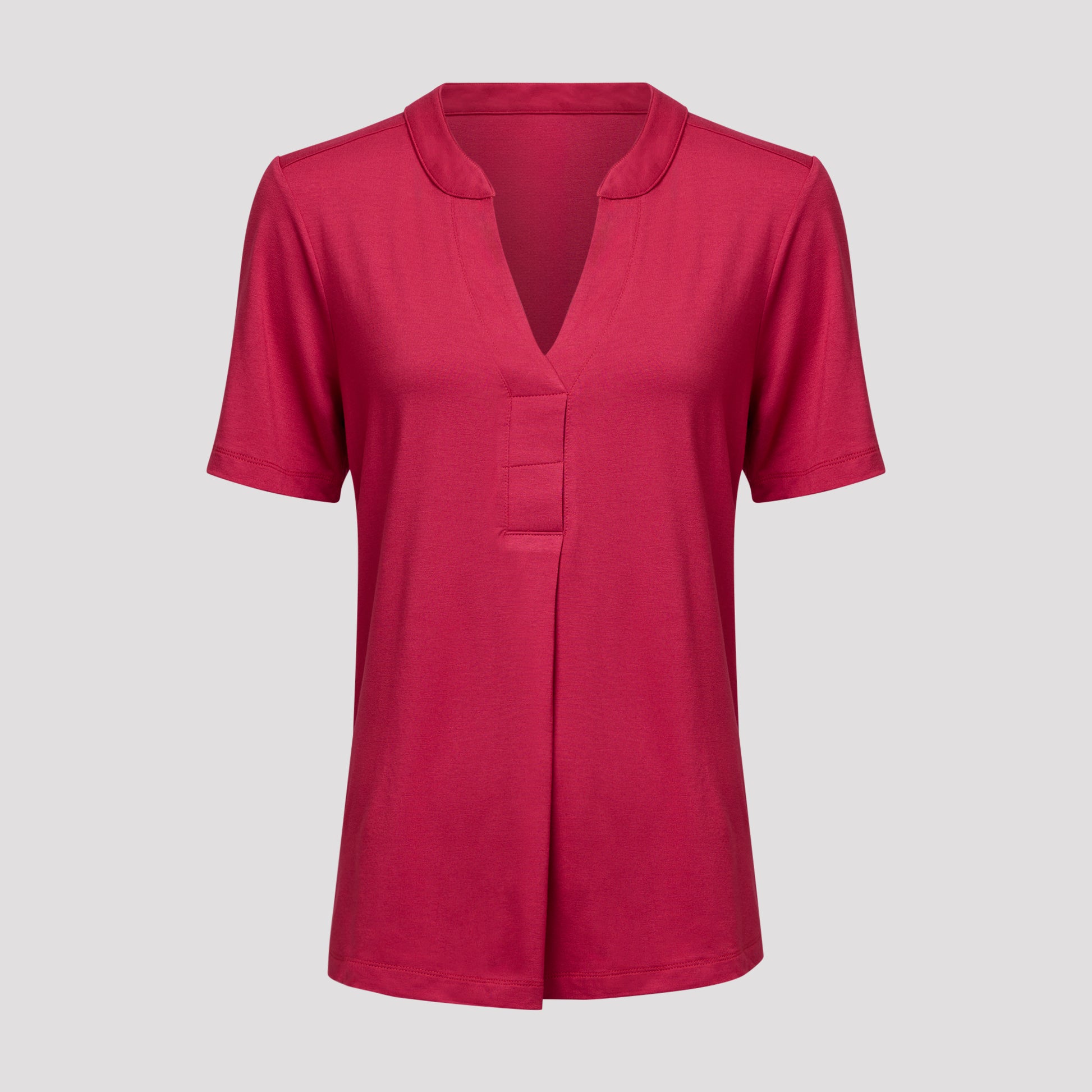 Hallonröd topp i viskos med har en key-hole urringning och ett veck framtill som gör att toppen passar för både mindre och större byst. Den kortärmade mjuka toppen är rundad nertill och något längre baktill. Vår modell Marianne är 173 cm och har storlek S på sig.